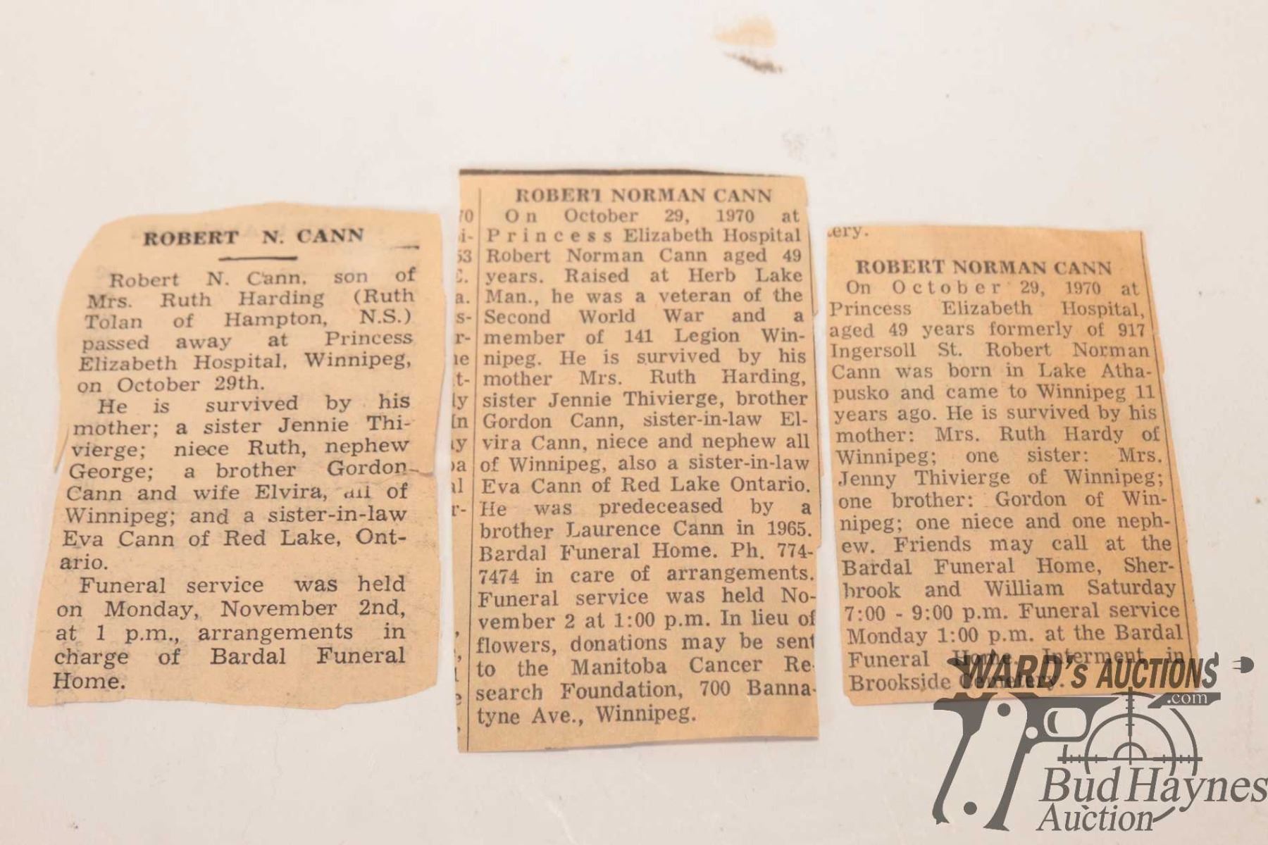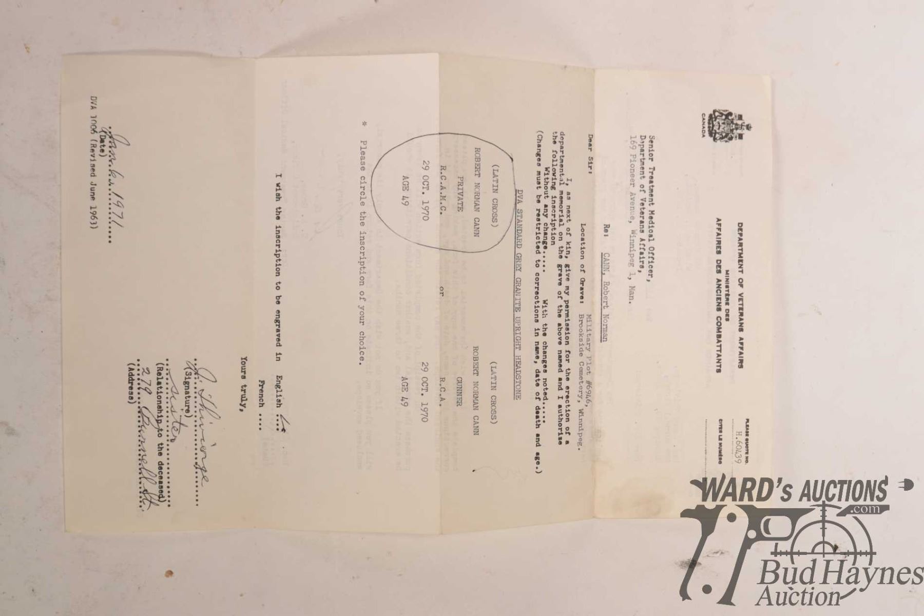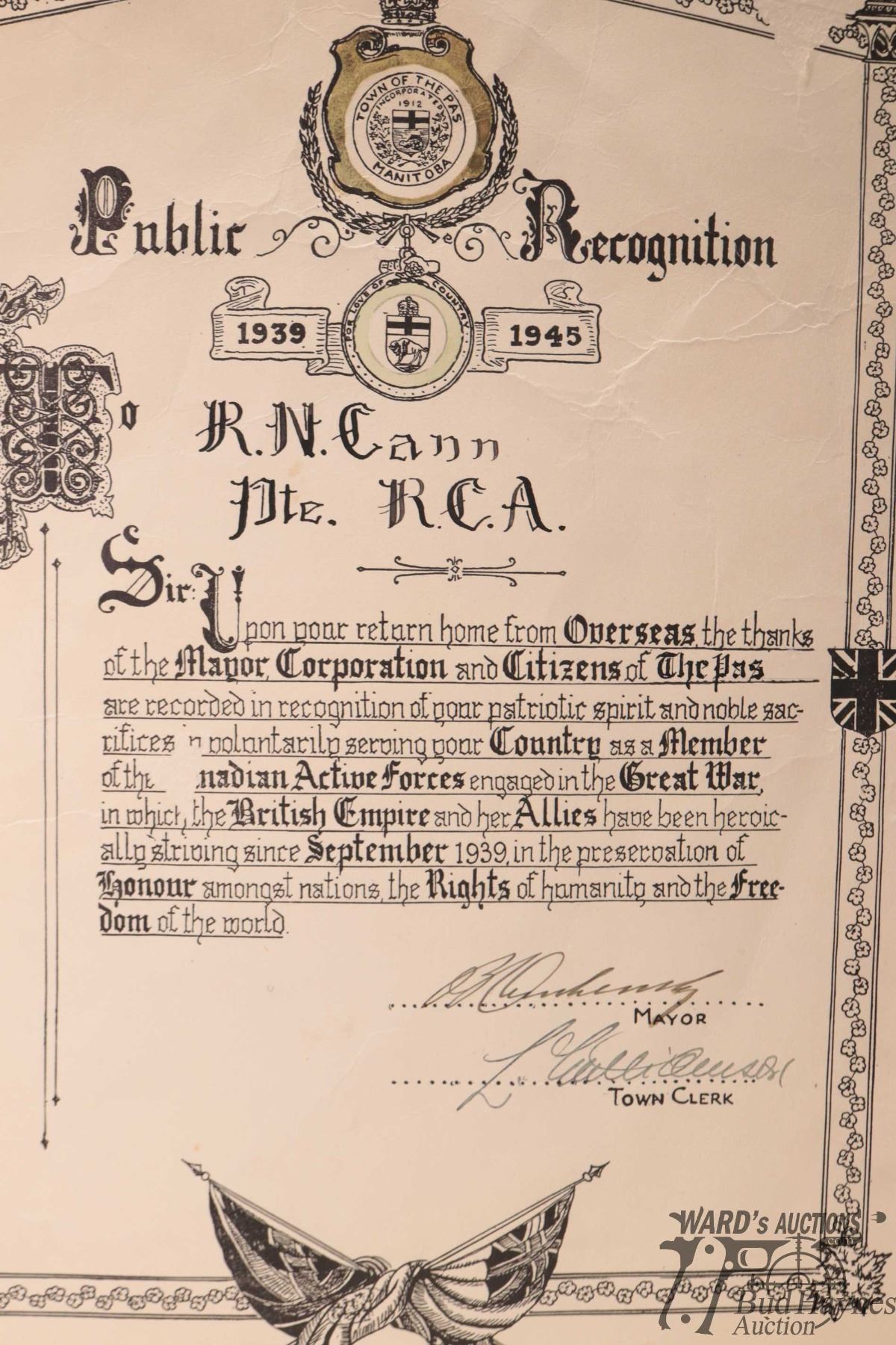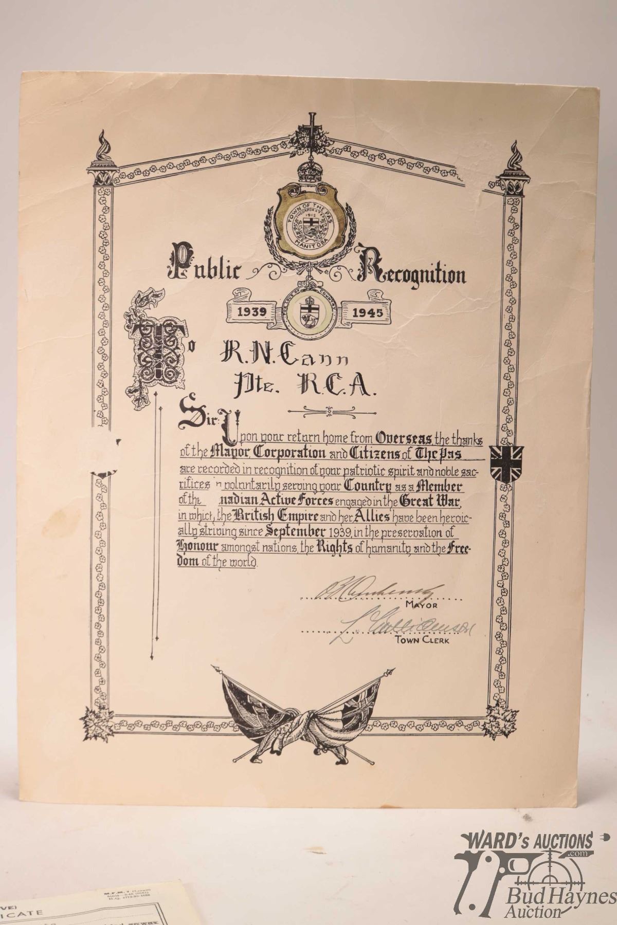 Six WWII replacement medals including 1939-1945 war medal, Canadian Volunteer Service medal. The Defence medal, 1939-45 Star, France and Germany Star and an Italian Star plus documents and photos related to Private Robert Norman Cann