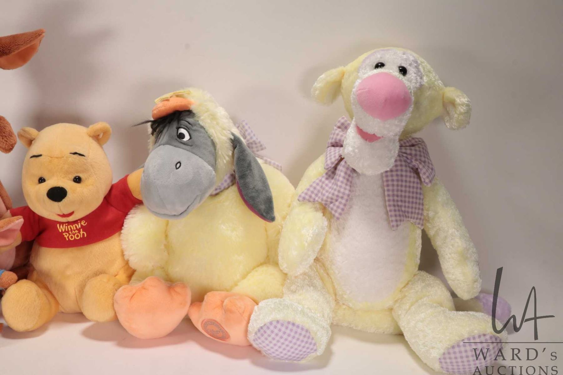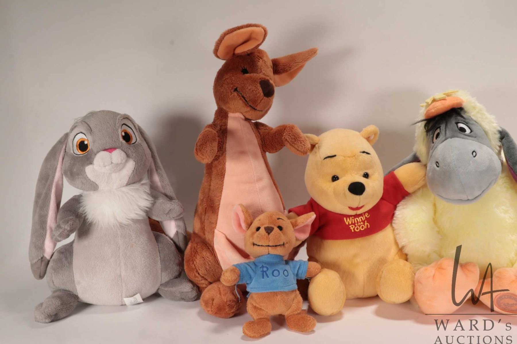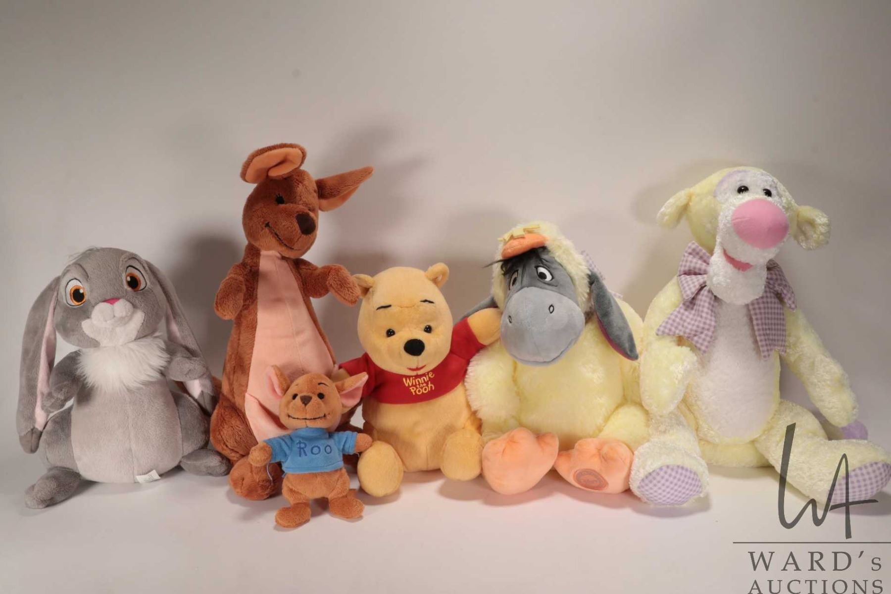 Six Winnie-the-Pooh stuffed animals including Winnie, Eyore, Tigger, Rue and Mama and Rabbit
