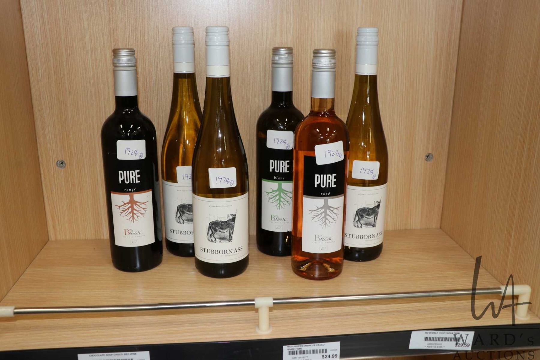 Six assorted bottles of wine including three Stubbornass German White Wine 750ml, one Pure Rouge 750ml, one Pure Rose 750ml, and one Pure Blanc 750ml Note: Alcohol cannot be insured by any courier in Canada. Local pick up is recommended. Canadian bidders only