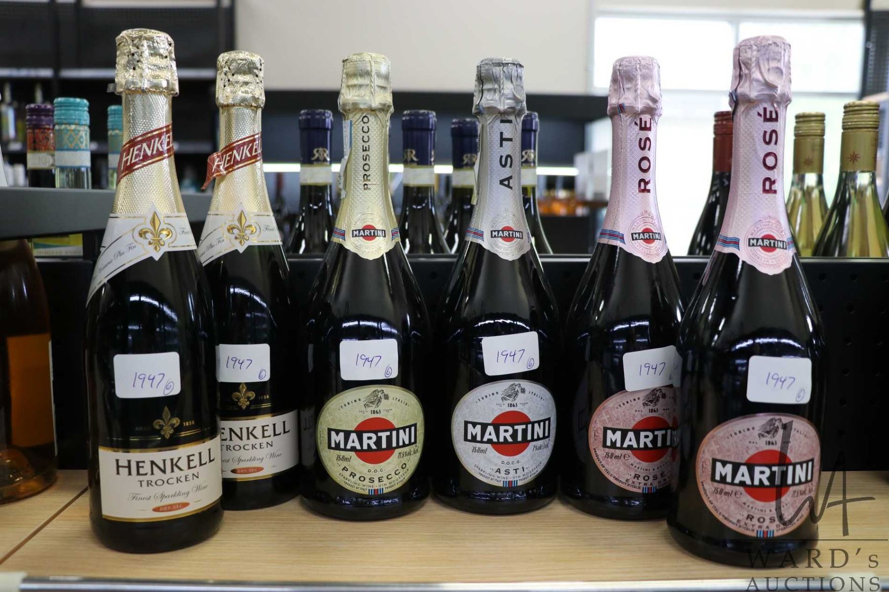 Six assorted bottles of wine including two Henkell Trocken finest dry sparkling wine, two Martini Rose 750ml / 11.5% ABV, one Martini Asti sparkling wine 750ml / 7% ABV, and a Martini Prosecco sparkling wine 750ml / 11.5% ABV Note: Alcohol cannot be insured by any courier in Canada. Local pick up is recommended. Canadian bidders only