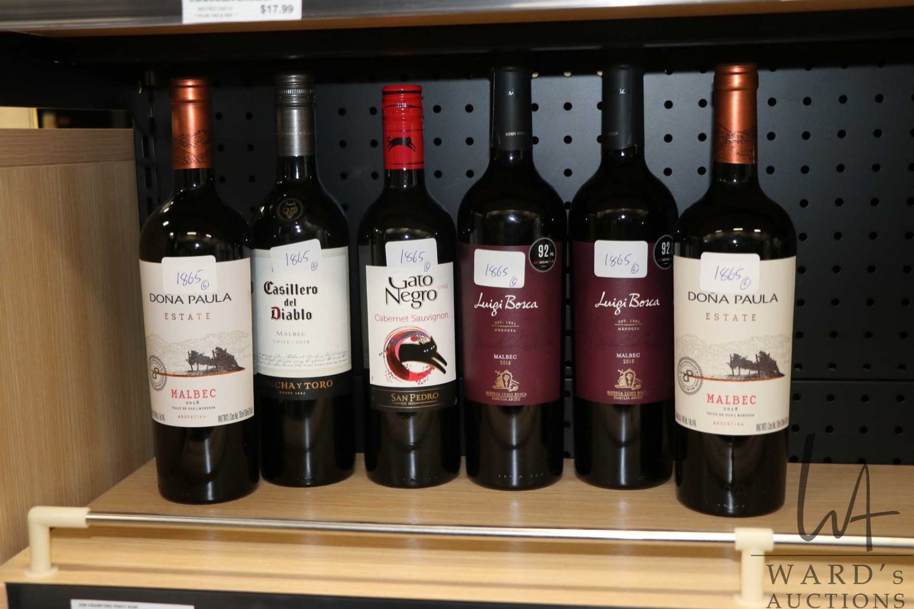Six assorted bottles of wine including two Luigi Bosca Malbec 2018 750ml, two Dona Paula Estate Malbec 2018 750ml / 14% ABV, a Casillero del Diablo Malbec 2018 750ml, and a Gato Negro Cabernet Sauvignon 750ml Note: Alcohol cannot be insured by any courier in Canada. Local pick up is recommended. Canadian bidders only