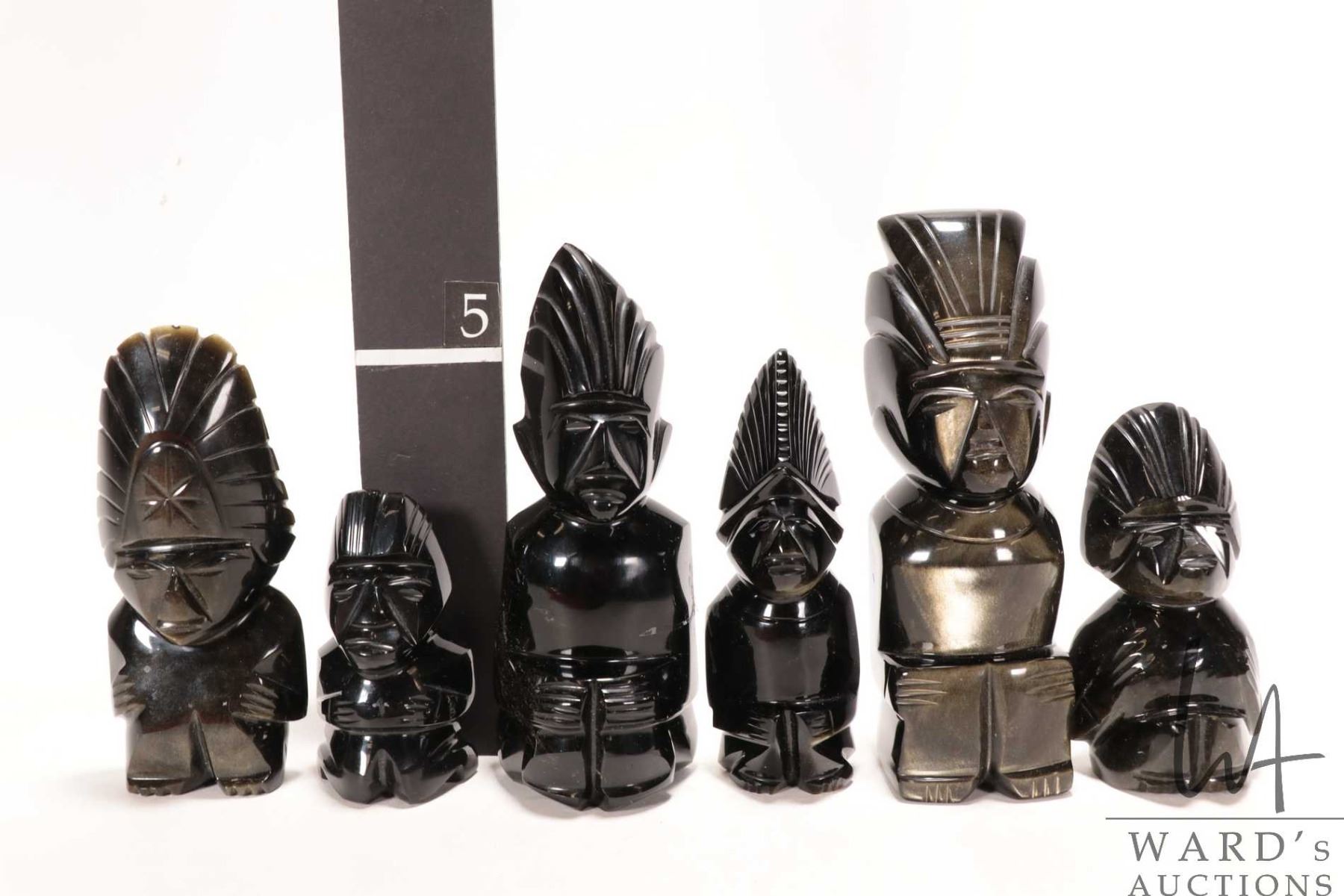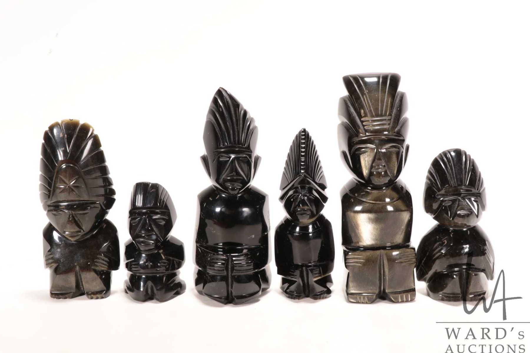 Six black and gold sheen hand carved obsidian Mayan Aztec figurines