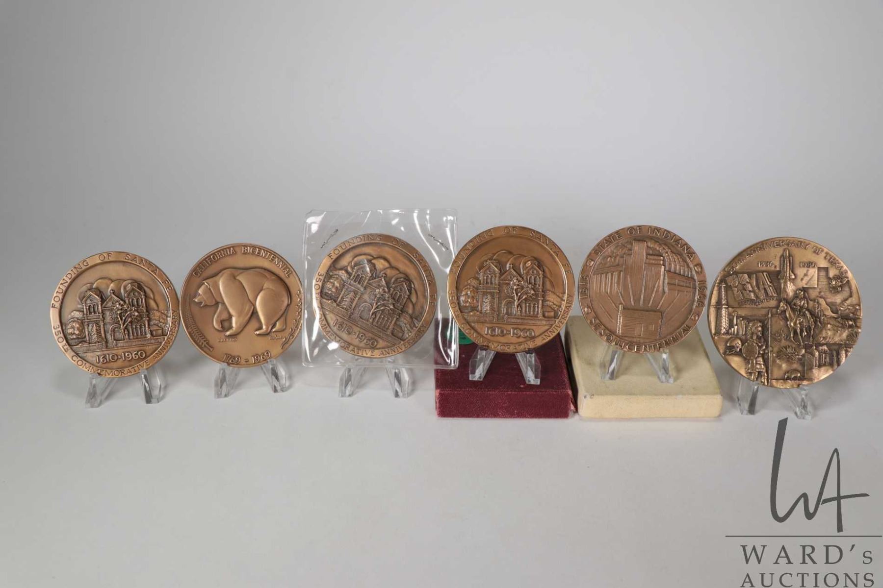 Six bronze medallions including two 2 1/2" 350th Commemorative Anniversary of the Founding of Santa Fe 1610-1960, 3" 150th Anniversary of Texas 1836-1986, 2 1/2" California Bicentennial 1769-1969, and 2 1/2" State of Indiana Sesquicentennial 1816-1966