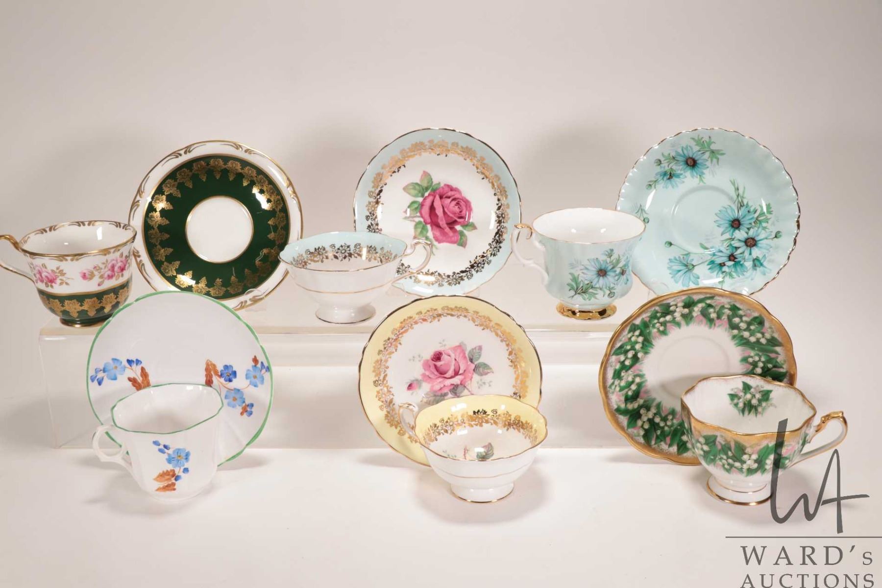 Six china teacups and saucers including Aynsley, Melba, Queen Anne, Paragon and Royal Albert