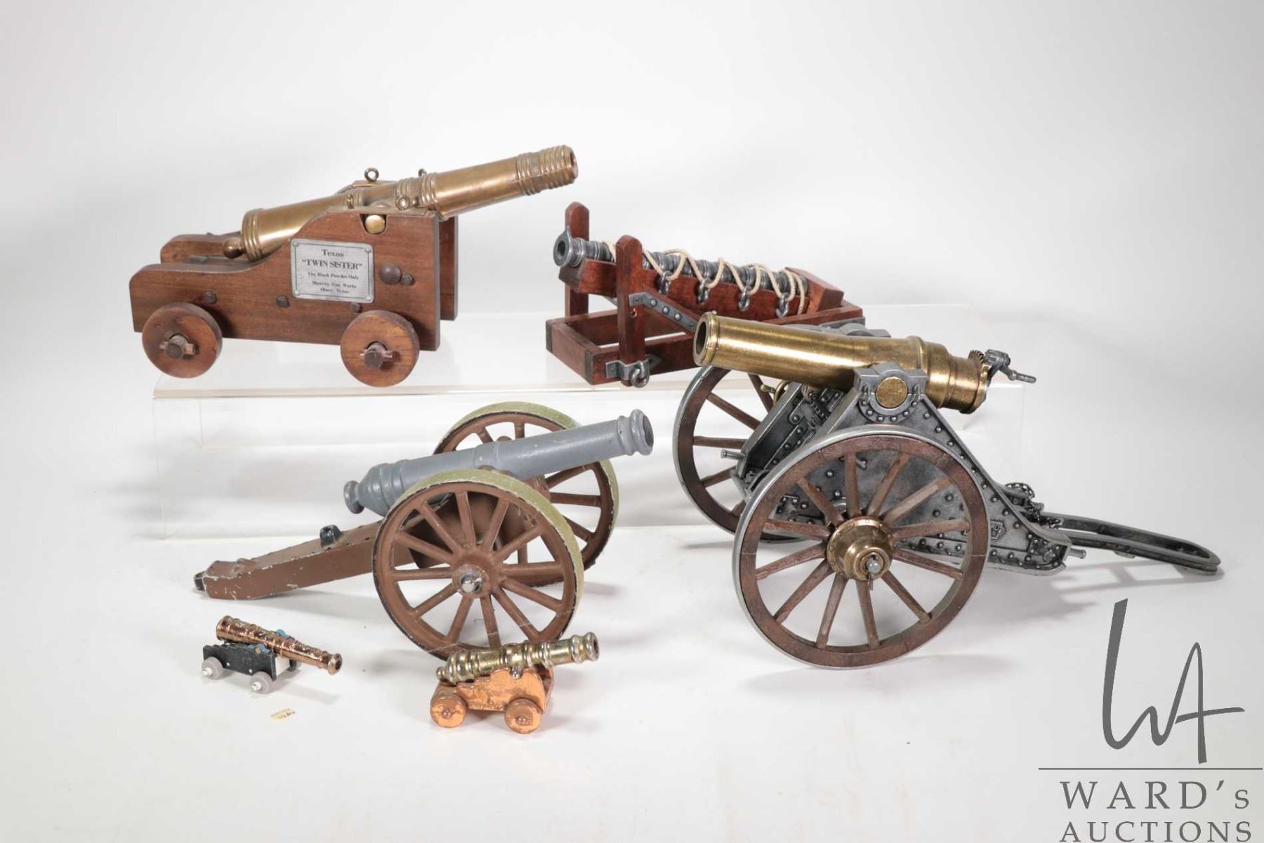 Six collectible cannons including, various styles and material including wood, brass, steel, aluminu