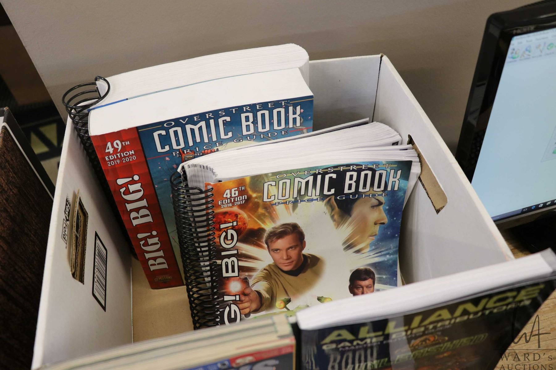 Six comic book price guide books. Important: Pickup is in Edmonton. Long comic boxes (28 x 8 x 11.5 and 23kg) will be shipped in 2 boxes approximately 11 x 9 x 12 and 13kg each through Canada Post. Long boxes can be palletized for large invoices. Details to follow