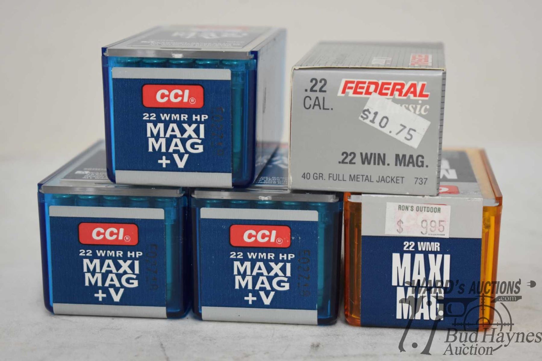 Six full 50 count packs CCI .22 WMR HP maxi mag v, one full 50 count pack CCI .22 WMR maxi mag FMJ and a full 50 count pack Federal classic .22 win mag 40 gr FMJ