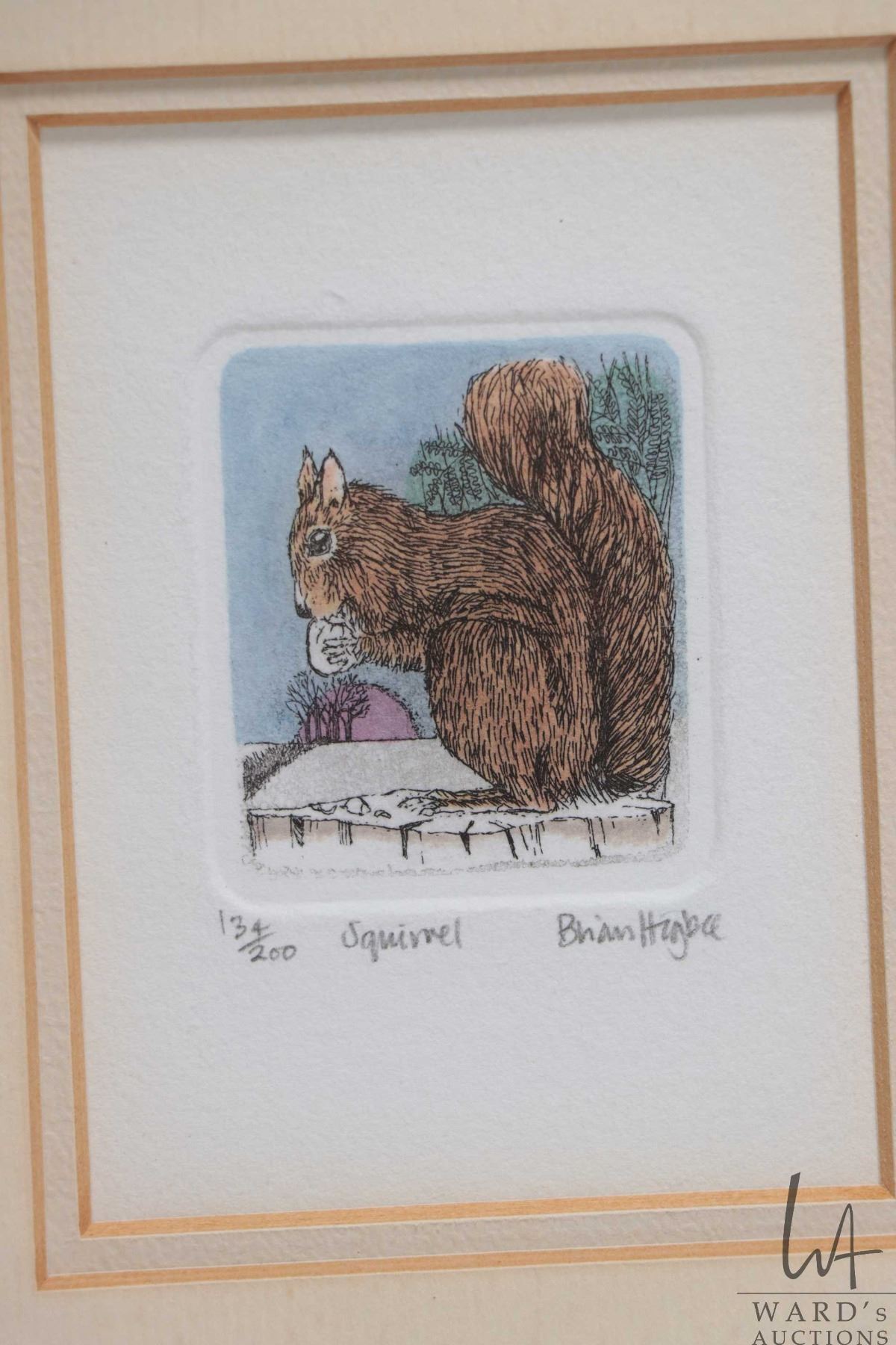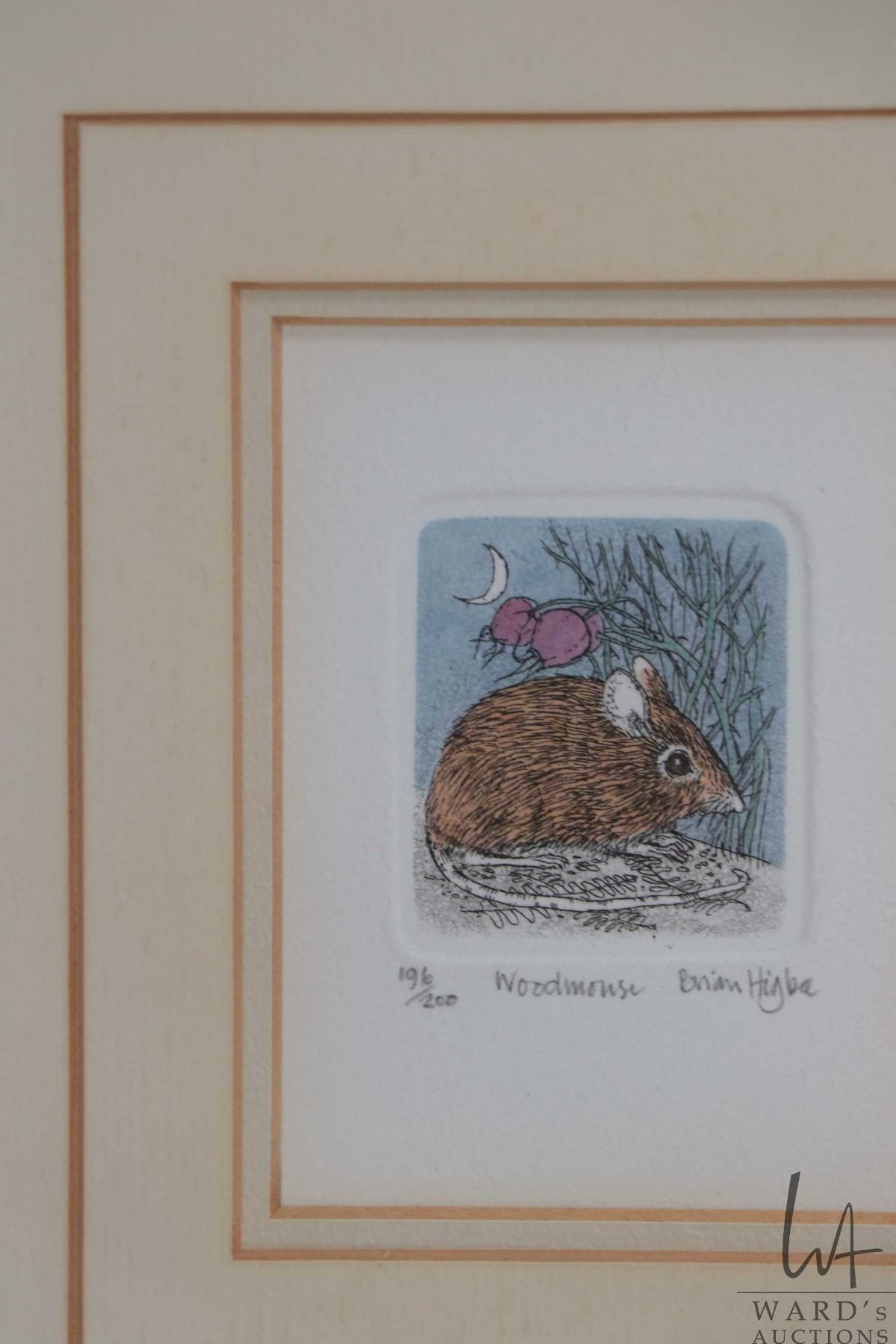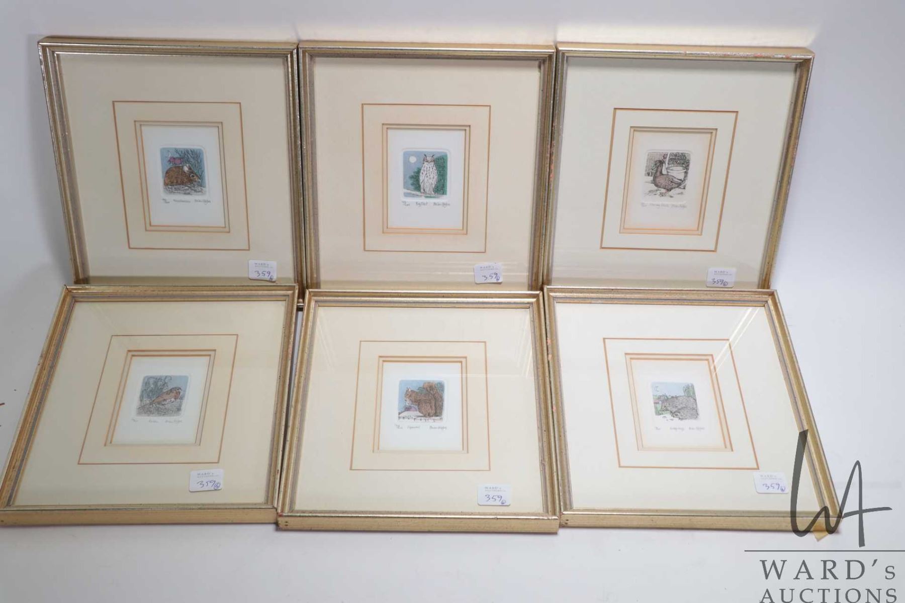 Six matched framed, limited edition miniature coloured etchings, all animal themed and all pencil signed by artist Brian Higbee, each out of 200 and each including frame 9 1/2" X 8 1/2"