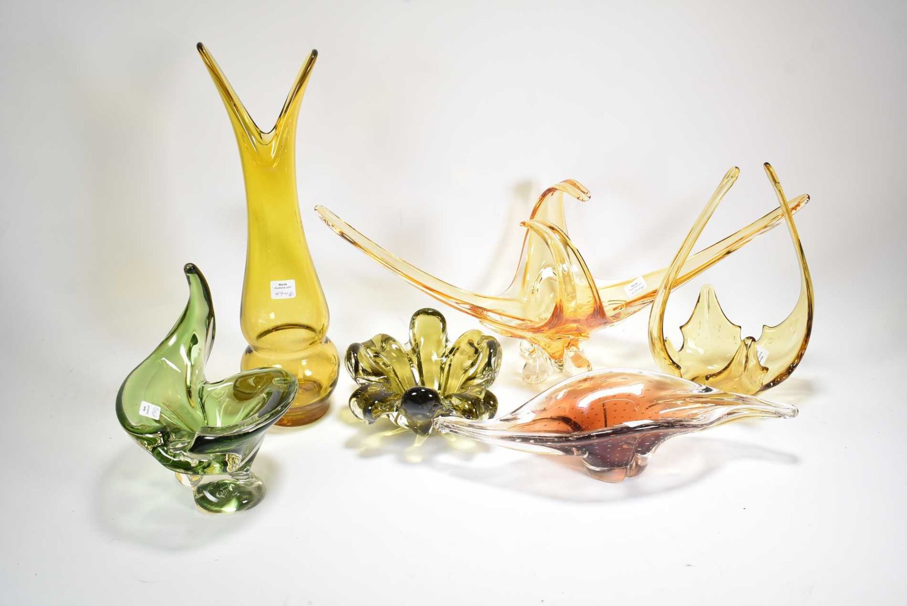 Six pieces of mid century art glass including two marked Chalet green glass dishes , a 16" yellow glass vase etc. Not available for shipping. Local pickup only