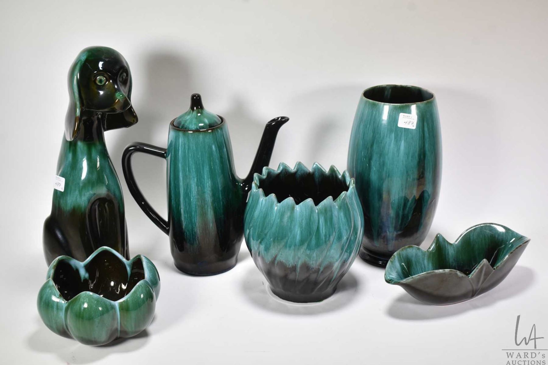 Six pieces of vintage Blue Mountain pottery including 13" dog, two flower vases, lidded coffee pot,