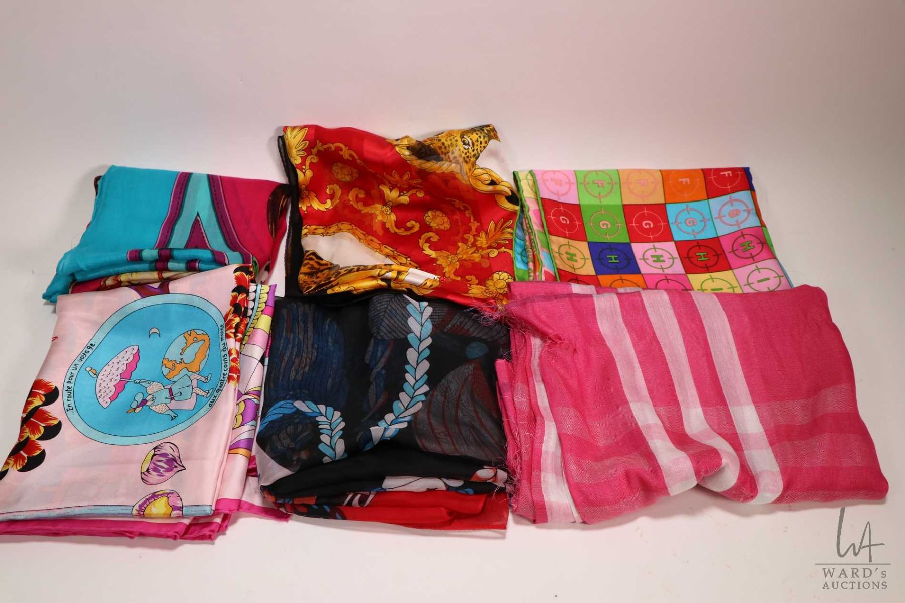 Six silk and silk chiffon scarves including some Hermes style- assume not authentic, each with hand rolled and hand stitched edges