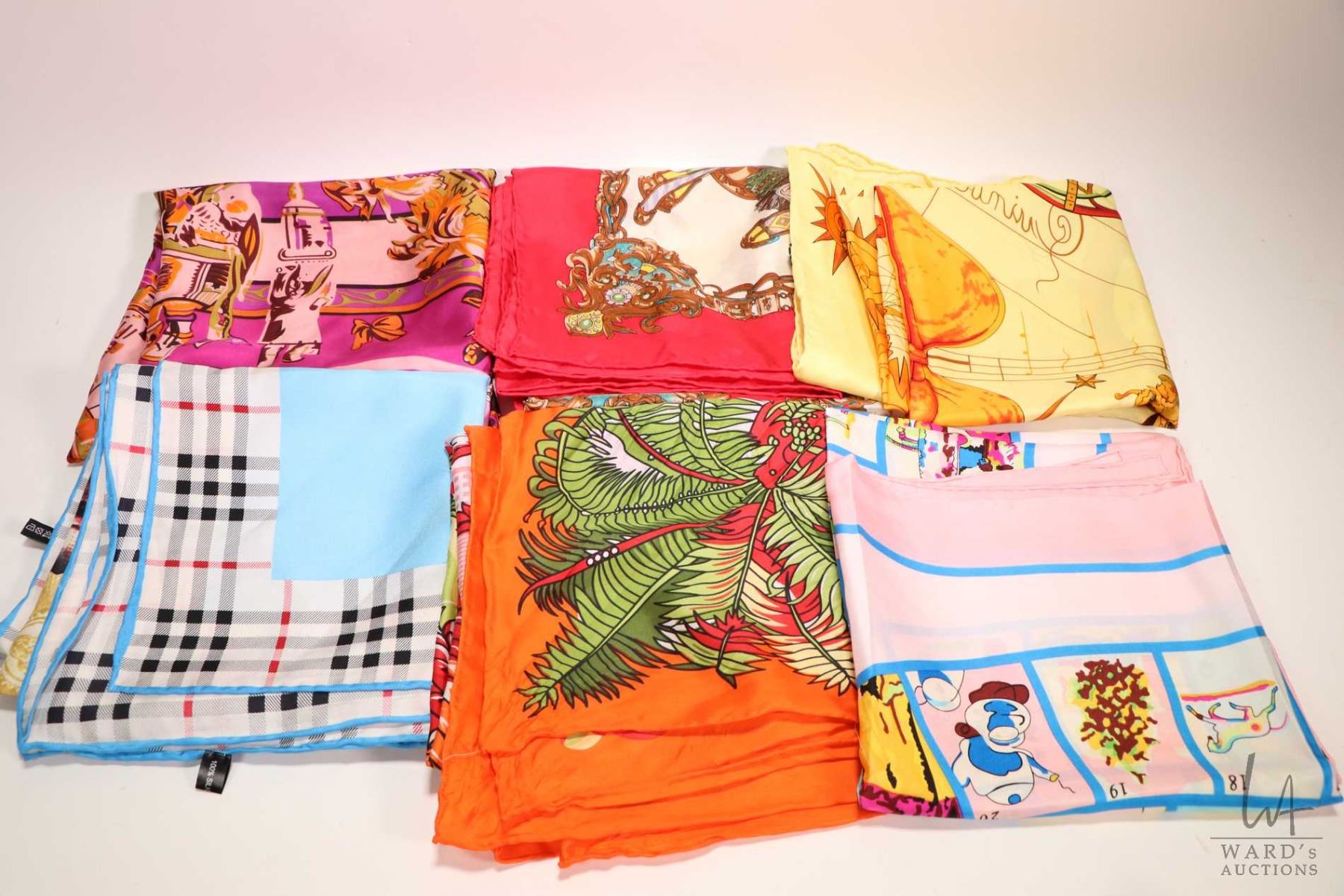 Six silk and silk chiffon scarves including some Hermes style- assume not authentic, each with hand rolled and hand stitched edges
