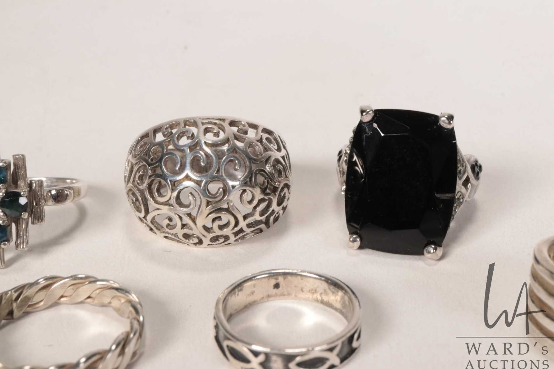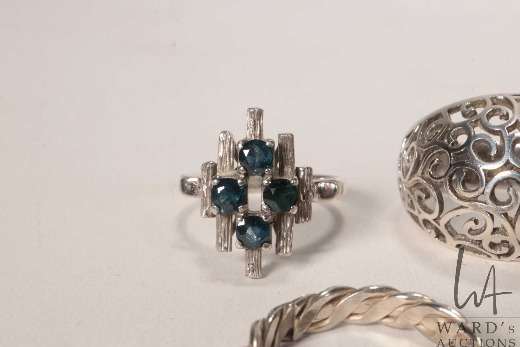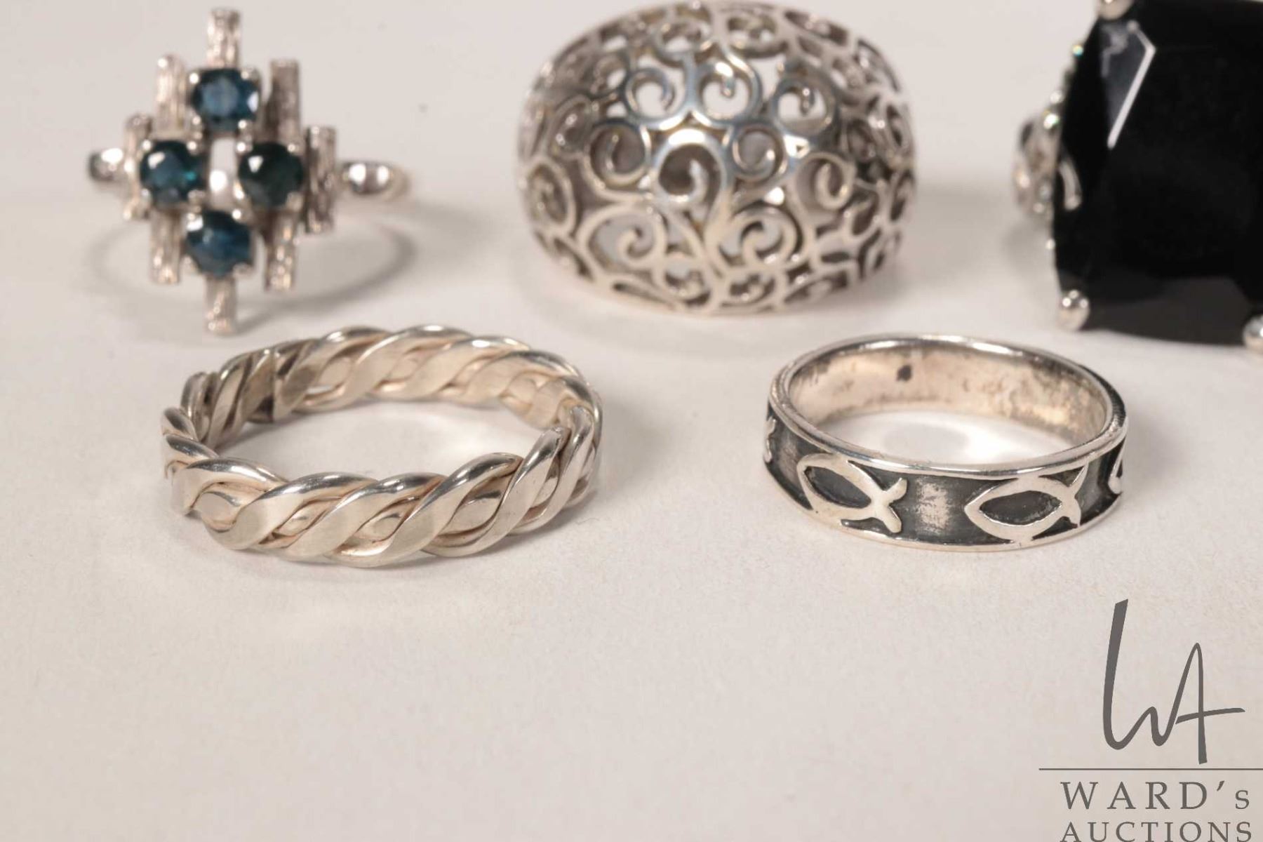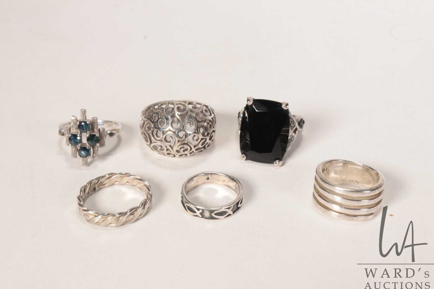 Six sterling silver rings, all marked 925, some set with gemstones, various sizes
