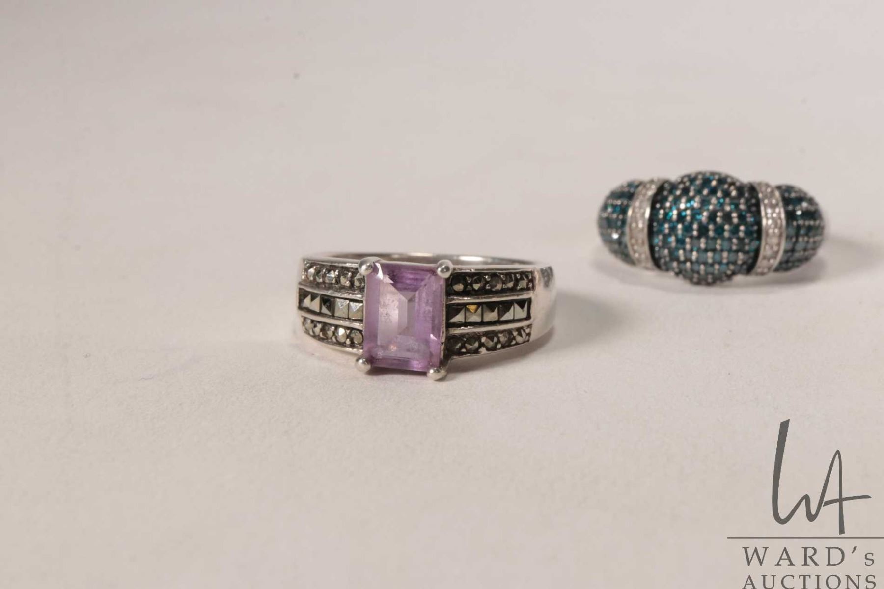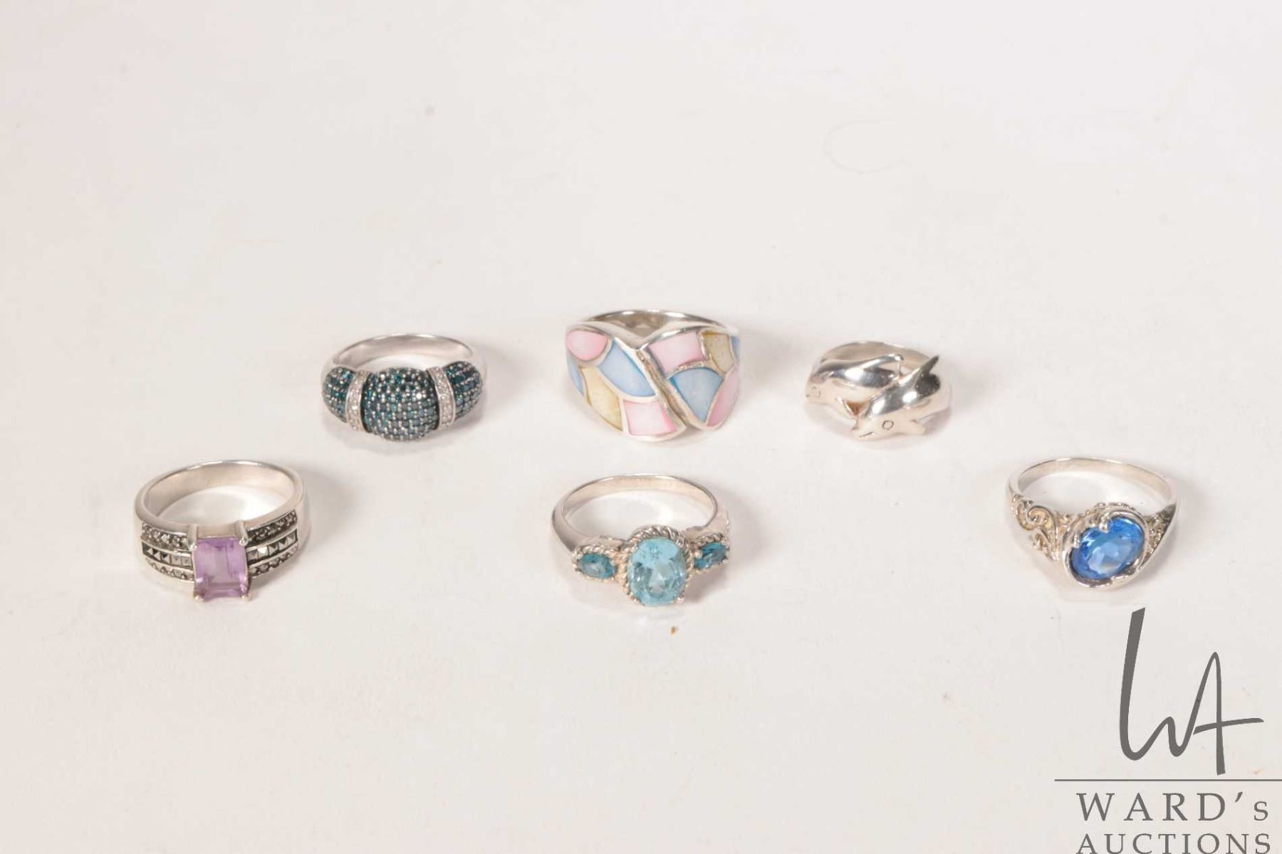 Six sterling silver rings, all marked 925, some set with gemstones, various sizes