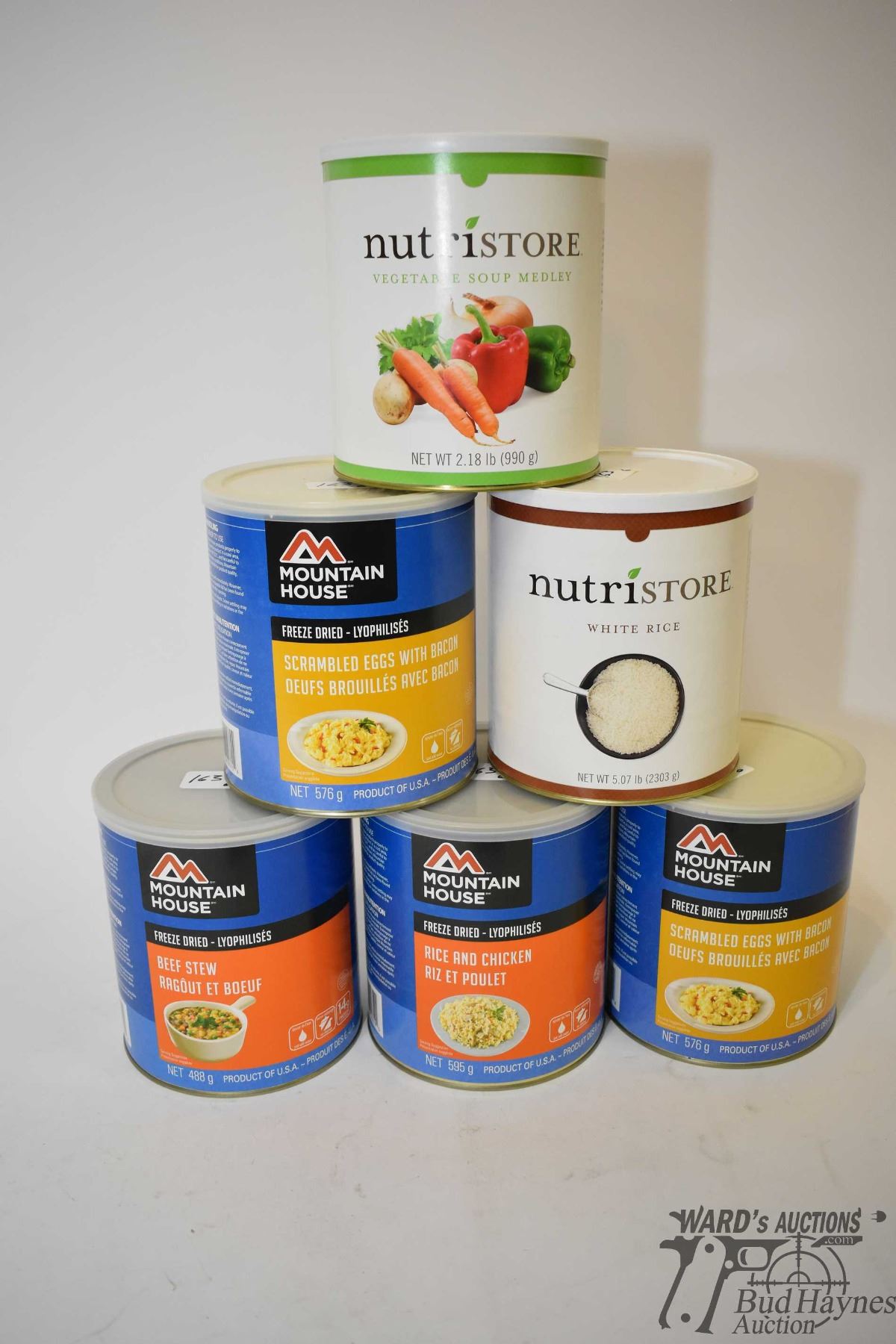 Six tins of freeze dried food including beef stew, Six tins of freeze dried food including beef stew, rice & chicken, scrambled egg w/ bacon x 2, rice and vegetable soup