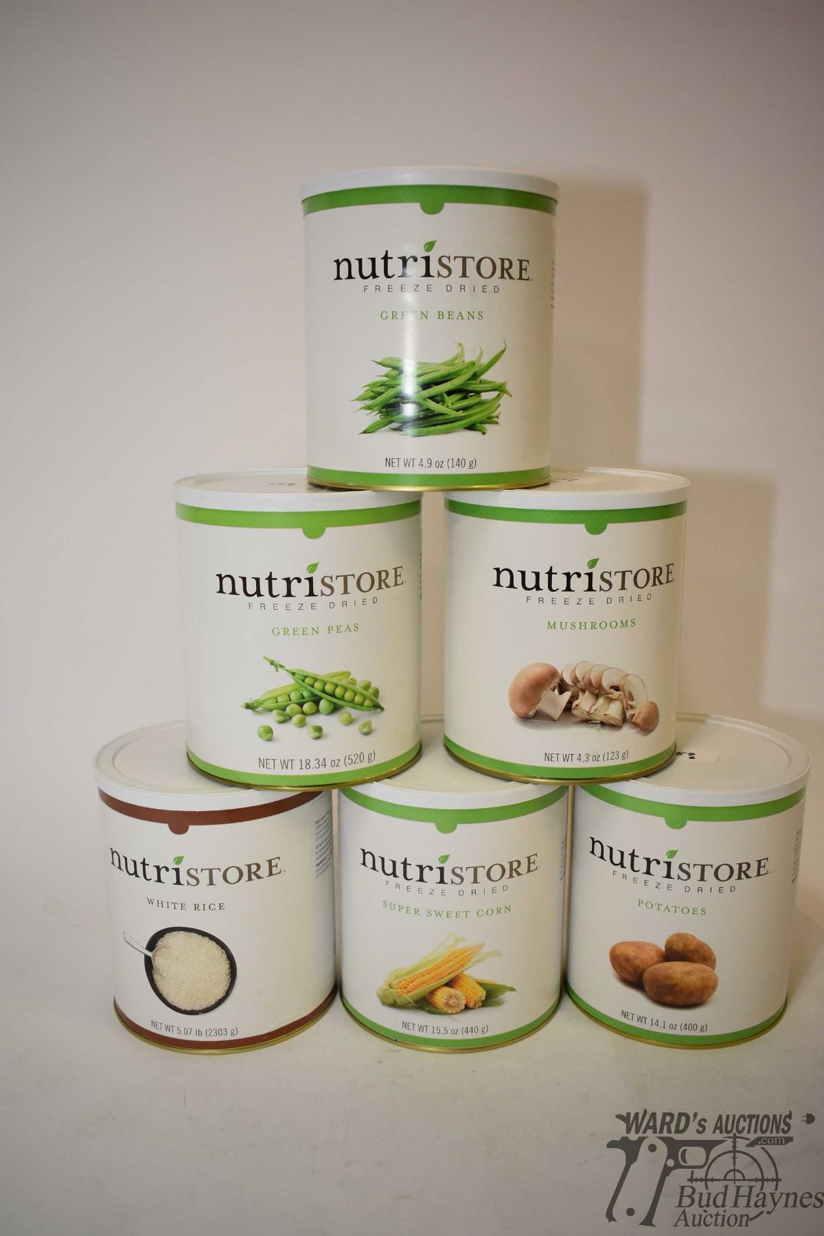 Six tins of freeze dried food including green Six tins of freeze dried food including green beans, rice, mushrooms, sweet corn, peas and potatoes