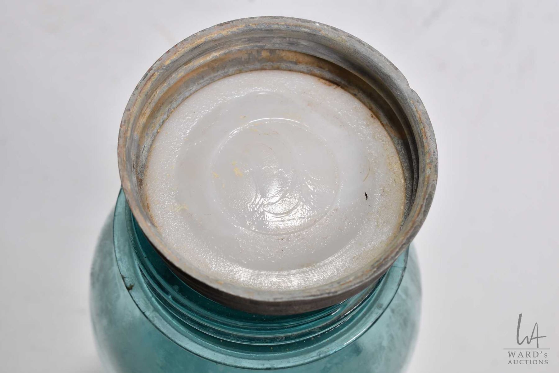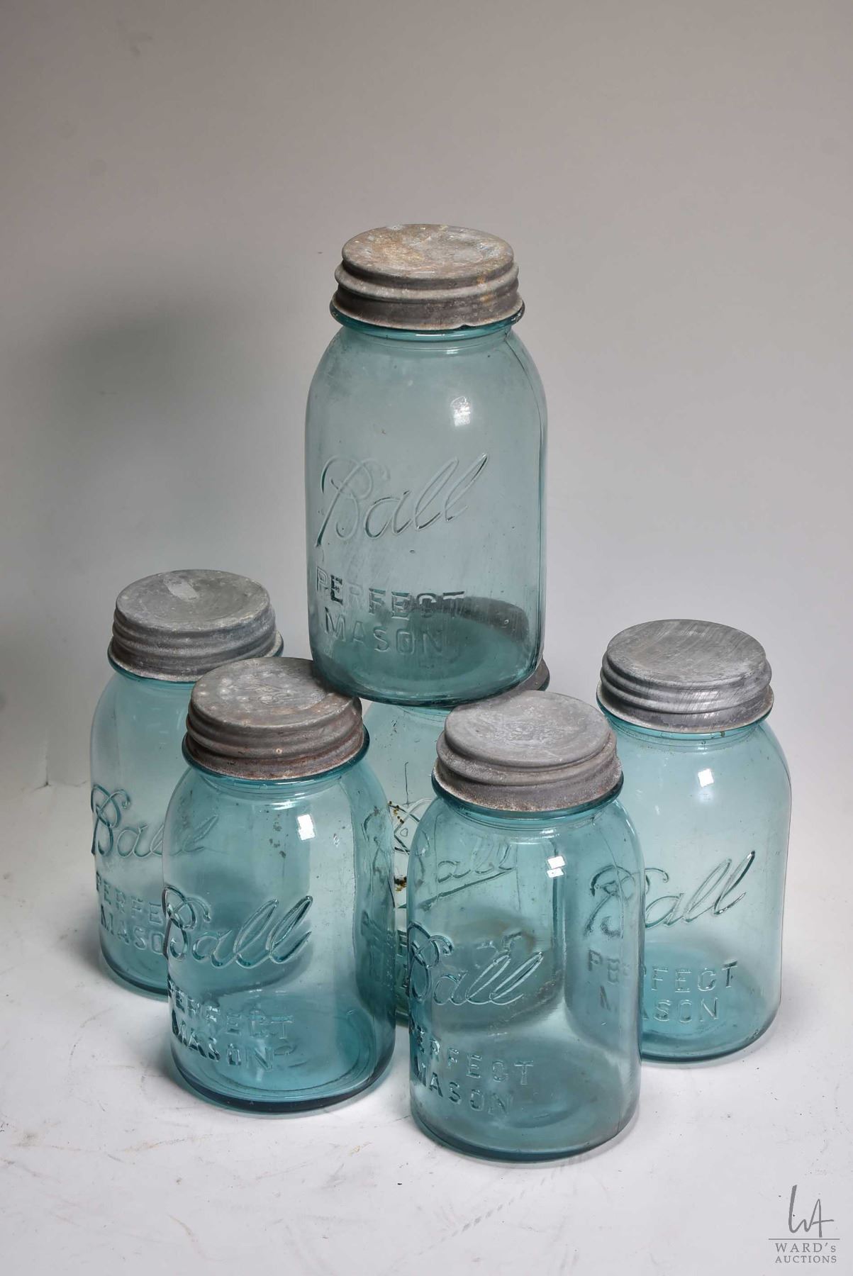 Six vintage Ball Perfect Mason sealing jars with original zink lids lined with milk glass