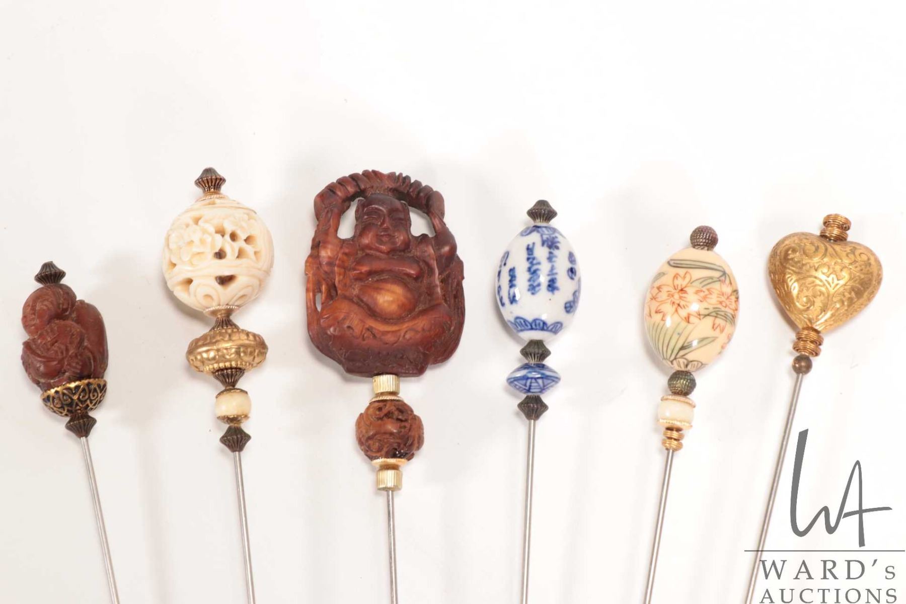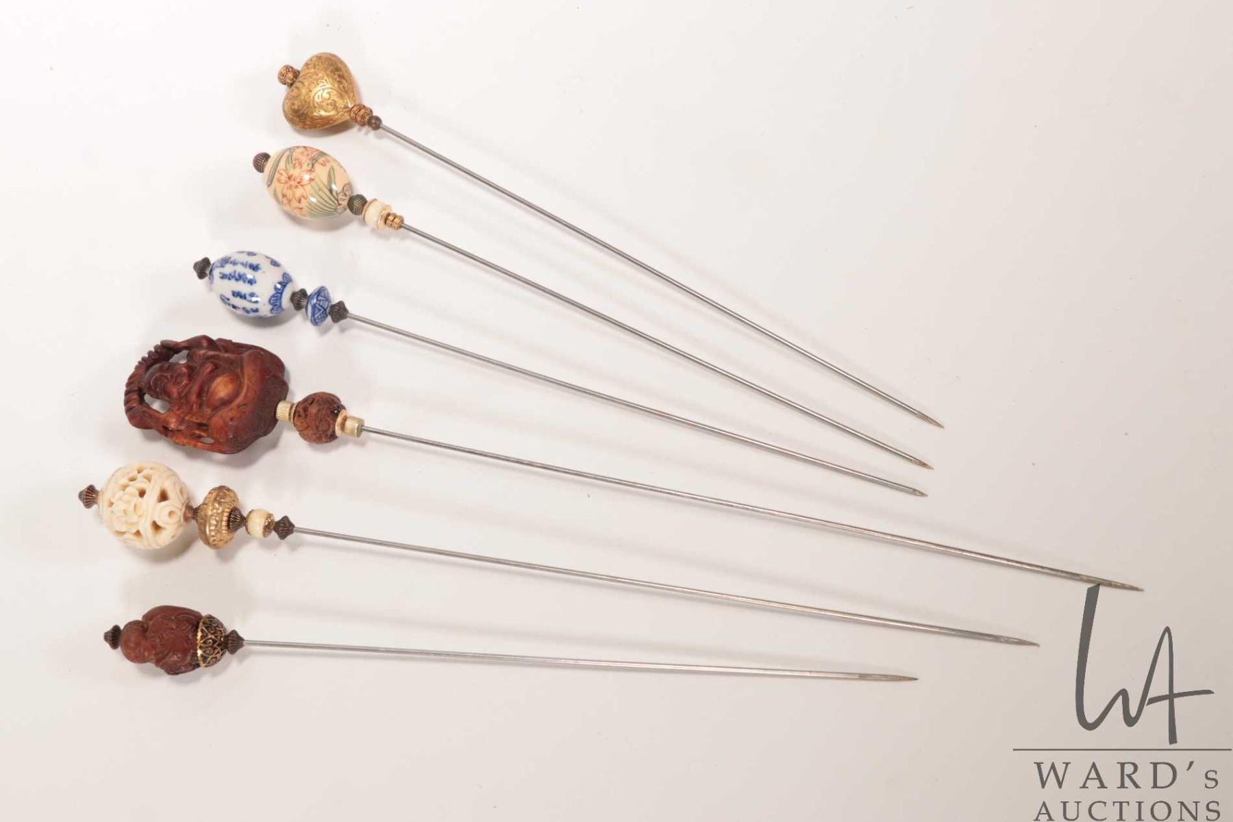 Six vintage hat pins including carved pieces, glazed porcelain, metalwork etc.