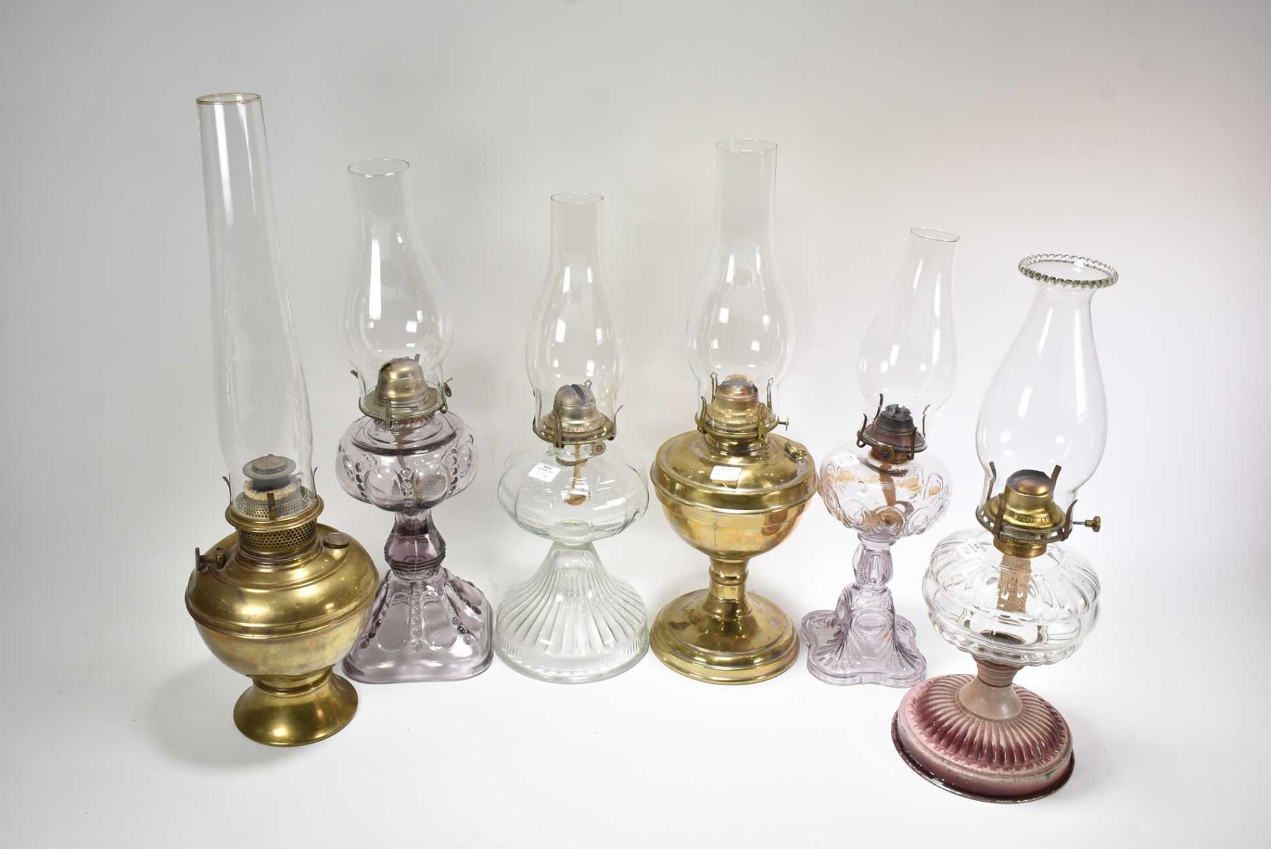 Six vintage oil lamps including brass Bradley & Hubbard with hurricane, metal lamp, four colourless lamps, two turning purple and one with a metal base