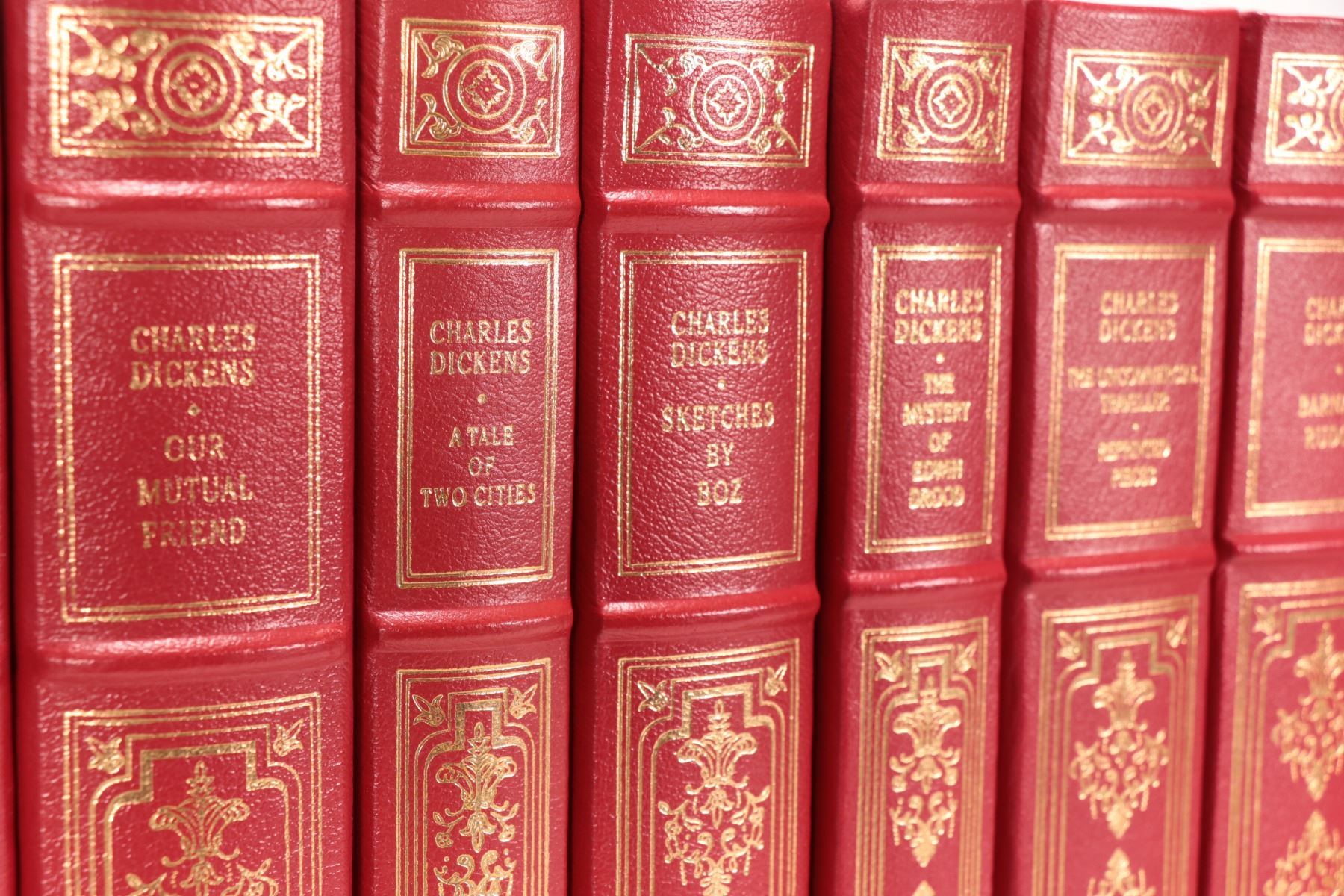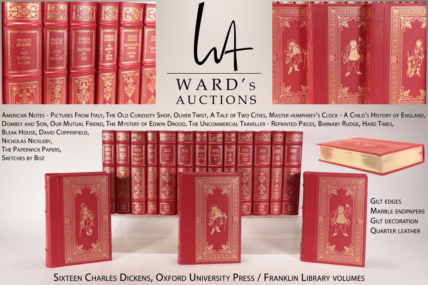 Sixteen Charles dickens The Oxford University Press / Franklin Library volumes including American Notes - Pictures From Italy, The Old Curiosity Shop, Oliver Twist, Dombey and Son, Our Mutual Friend, The Mystert of Edwin Drood, Bleak House, David Copperfield, The Paperwick Papers, Sketches by Oz, A Tale of Two Cities, The Uncommercial Traveller, Master Humphrey's Clock - A Child's History of England, Barnaby Rudge, Hard Times. Books are in good shape, gilt edges, marble end papers, gilt decoration, quarter leather