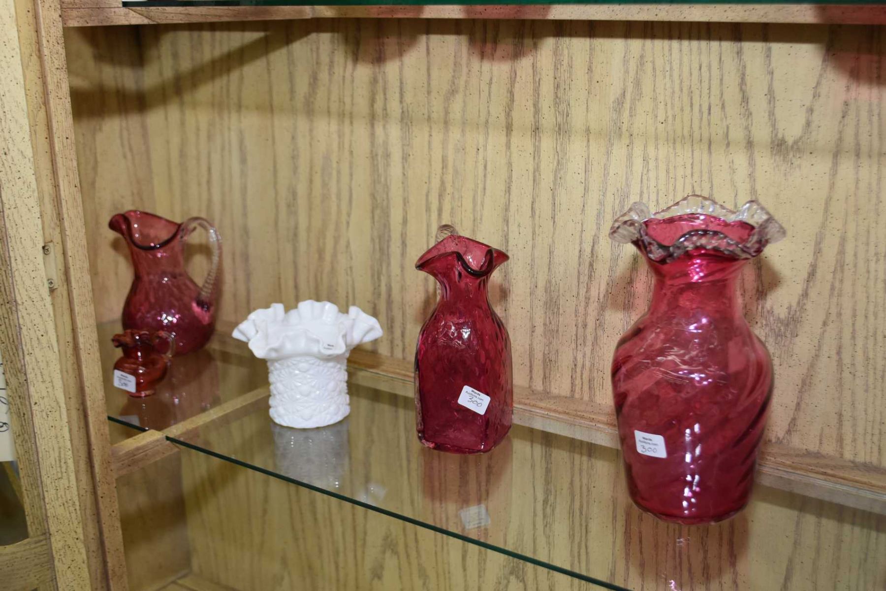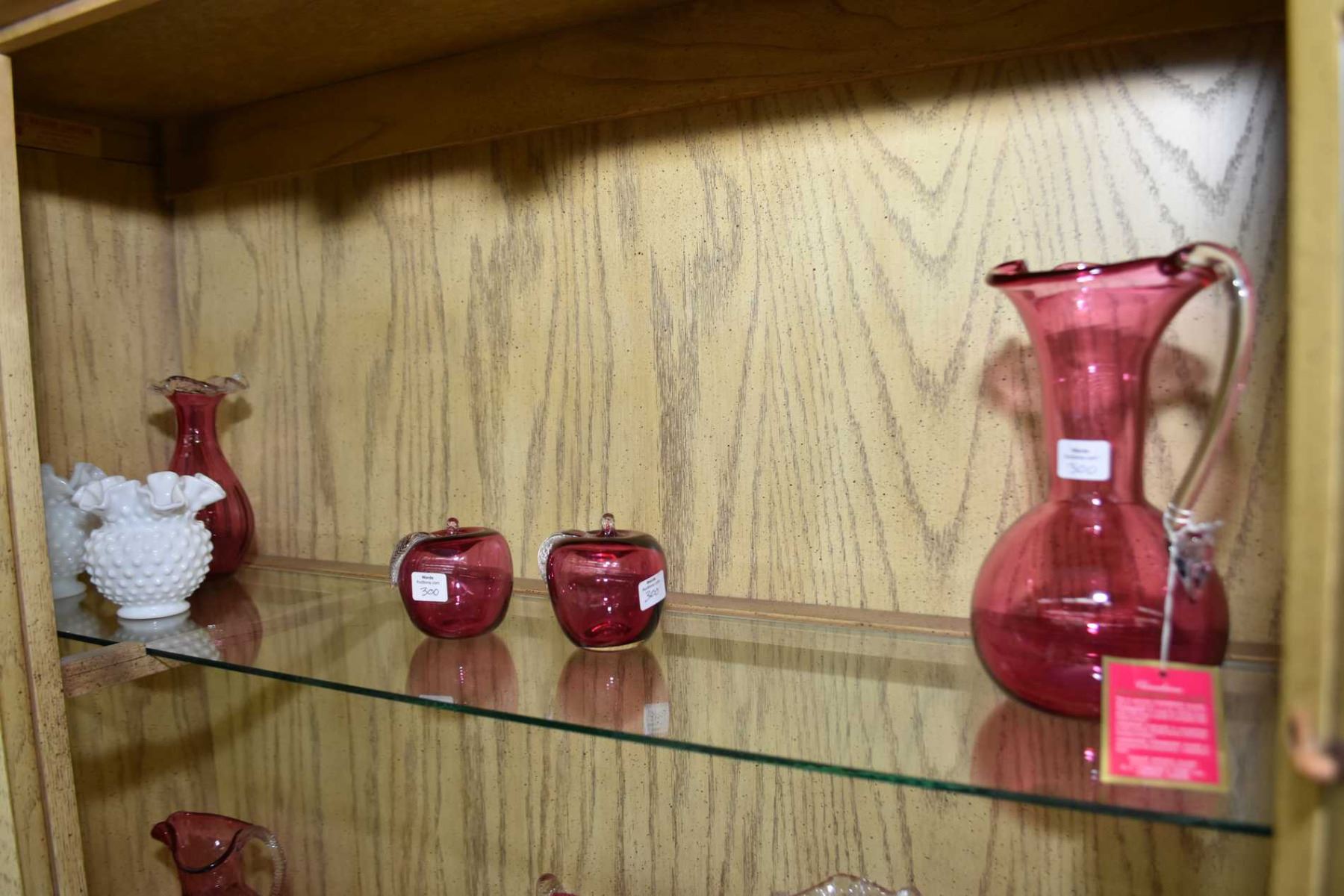 Sixteen pieces of collectible glass including cranberry apples, pitchers, vases, milk glass includin