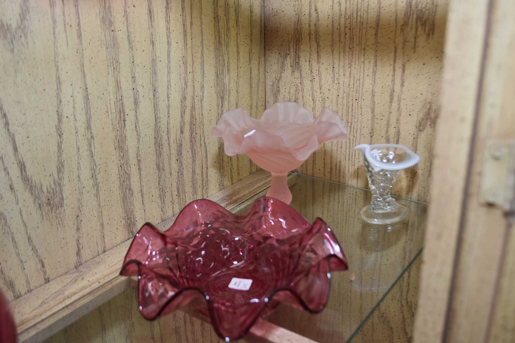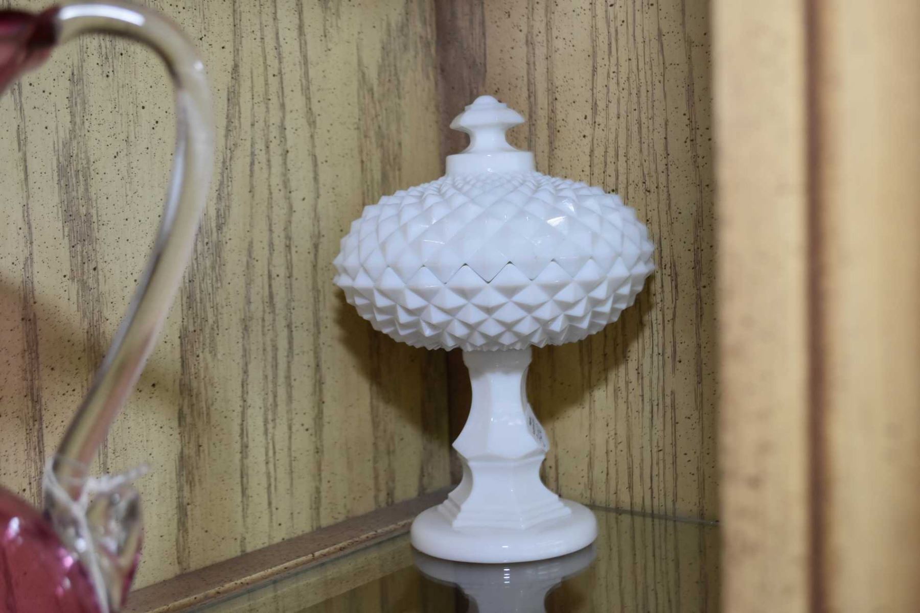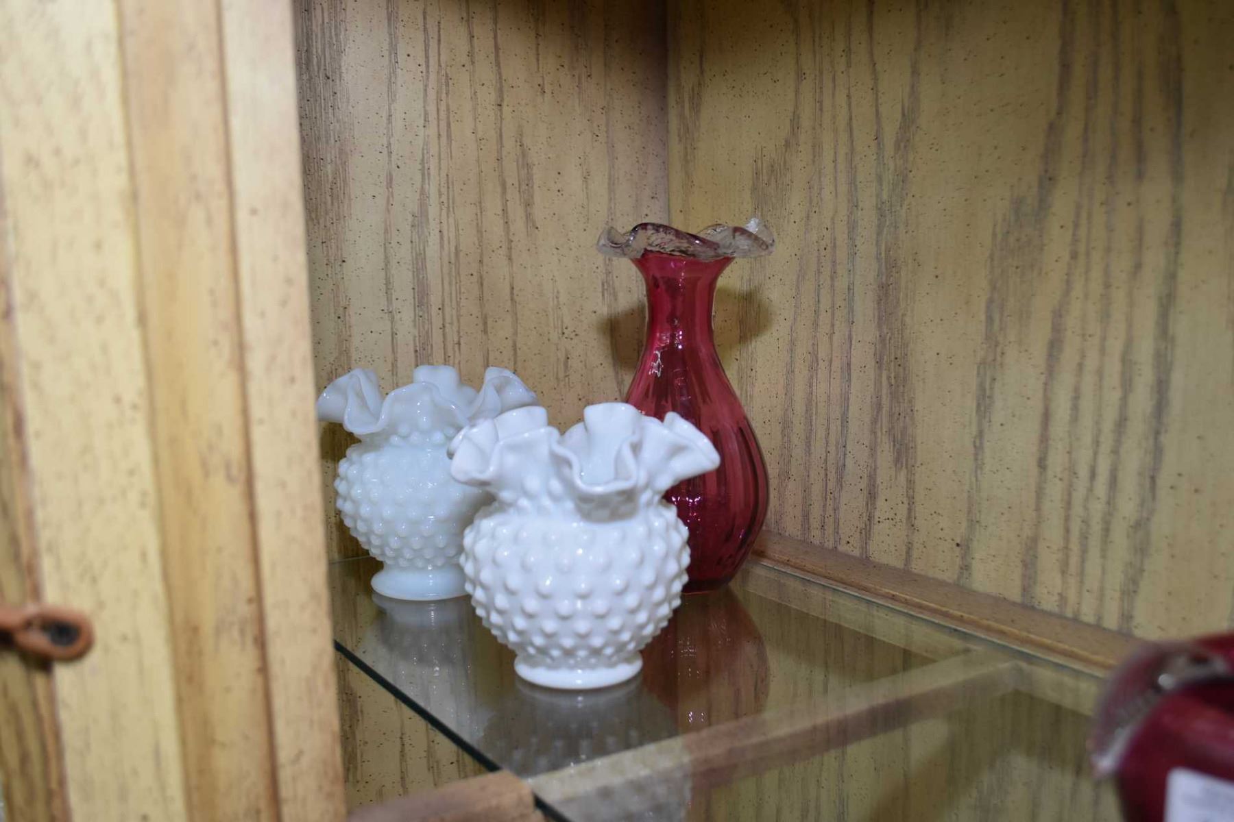 Sixteen pieces of collectible glass including cranberry apples, pitchers, vases, milk glass including hobnail rose bowls, lidded comport etc.
