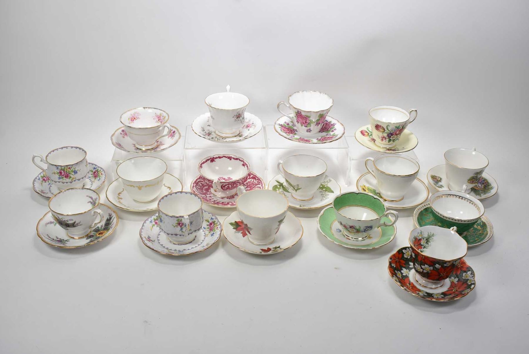 Sixteen teacups and saucers including Royal Albert, Crown Stafford, Grafton, Coalport, Royal Vale, P