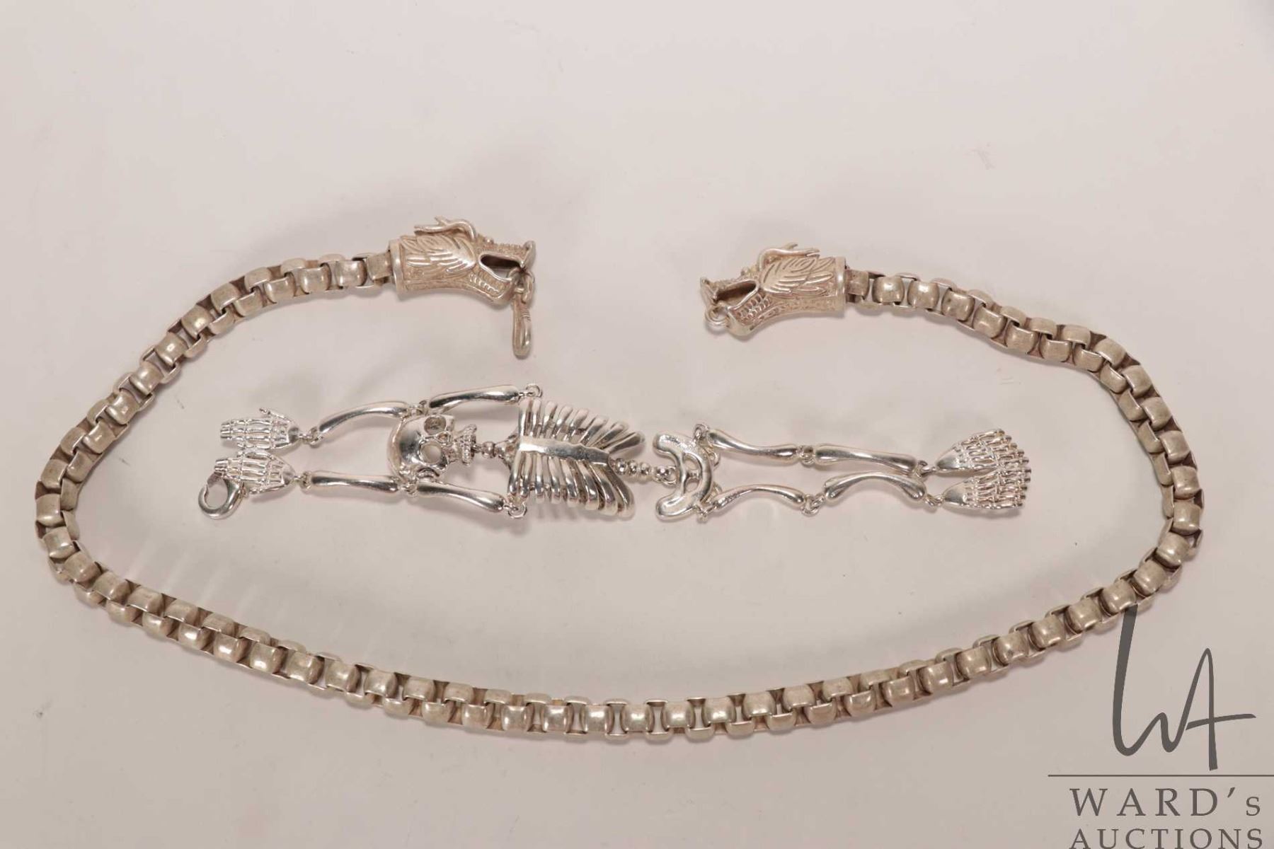 Skeleton bracelet and a double headed dragon necklace