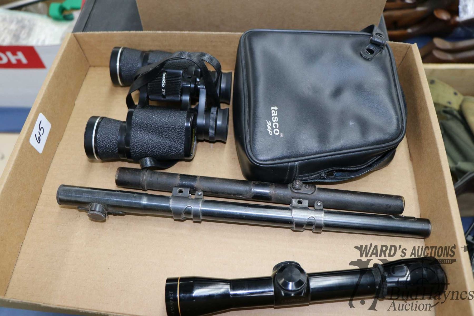 Small Leupold M8-4X compact scope, Mossberg M4 scope and a Weaver G4 scope plus a pair of Tasco 7-35X binoculars in case