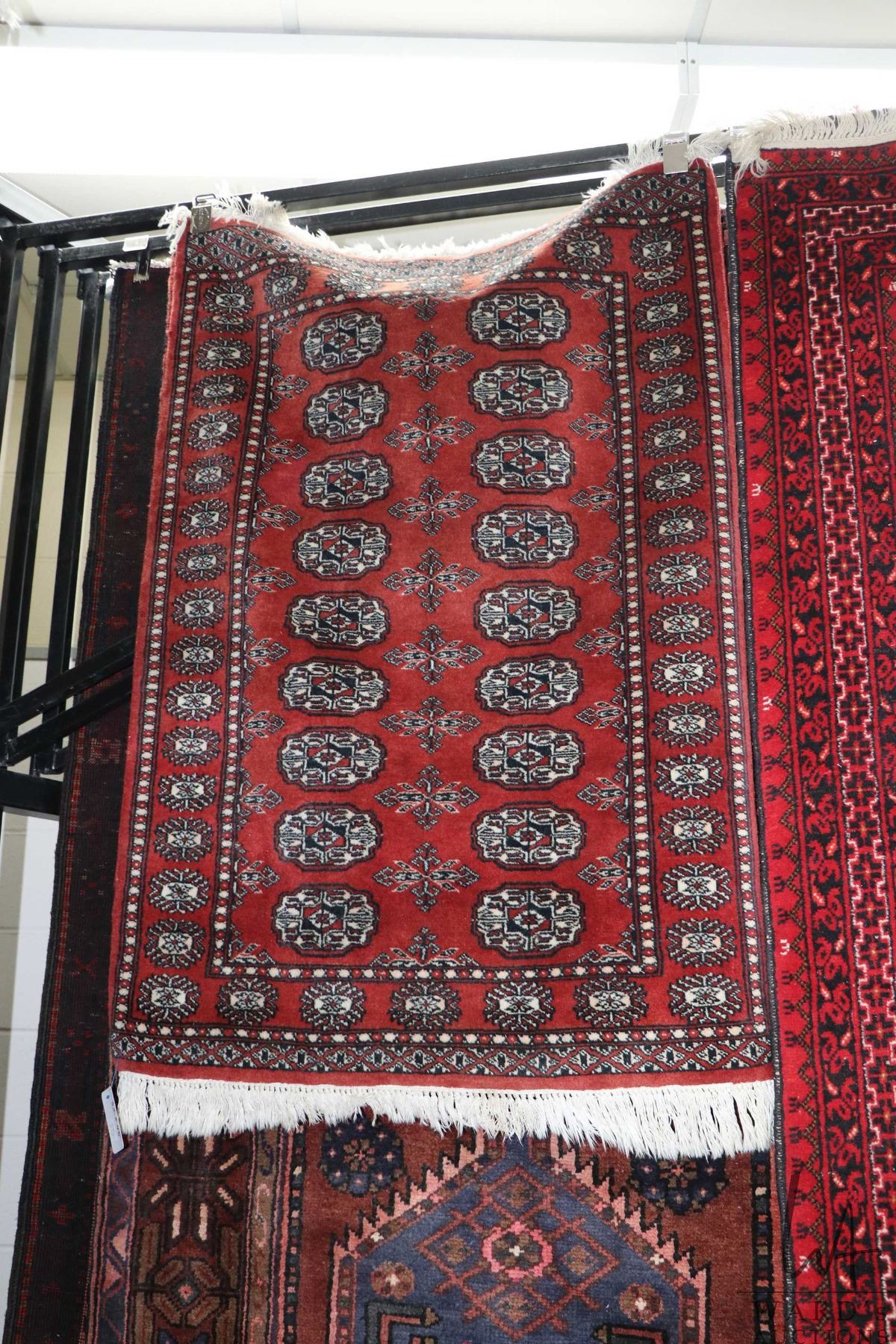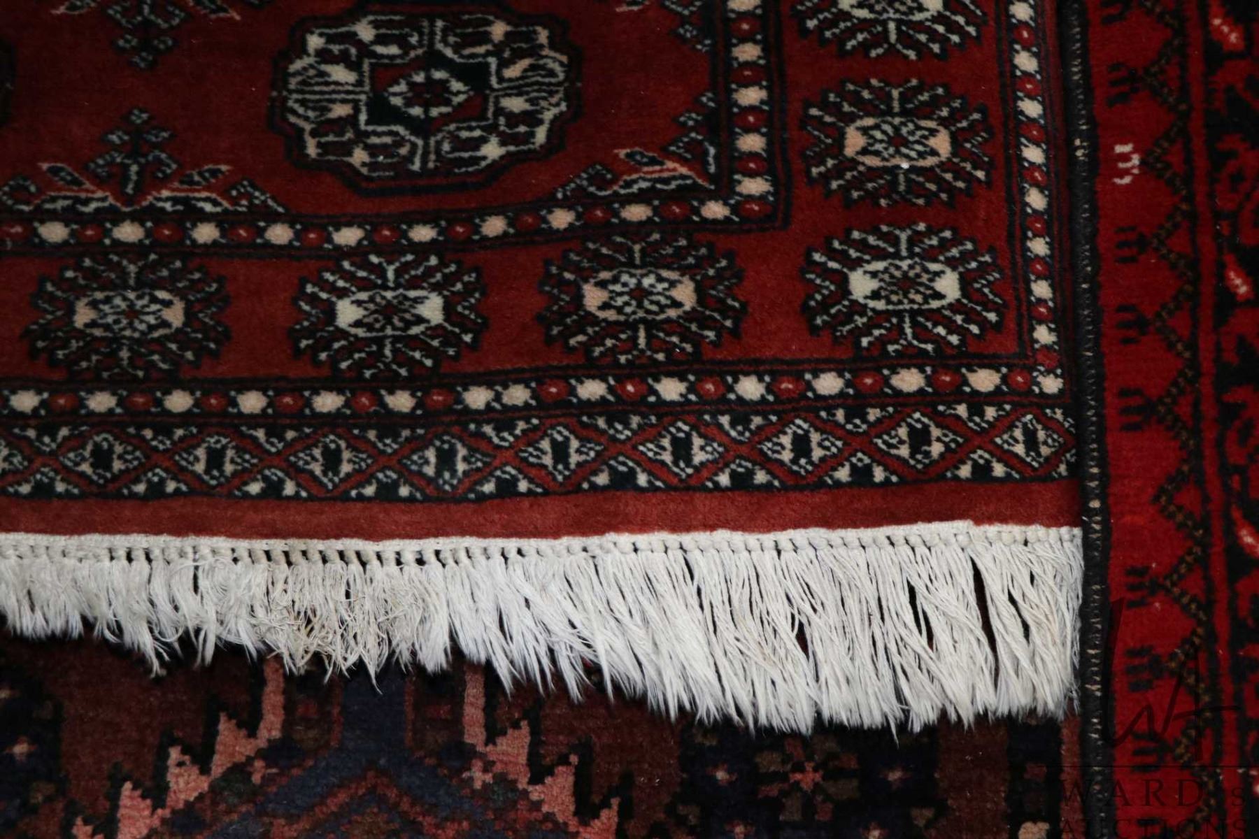 Small fringed scatter rug with red background and highlights of blue and cream, 32" X 45"