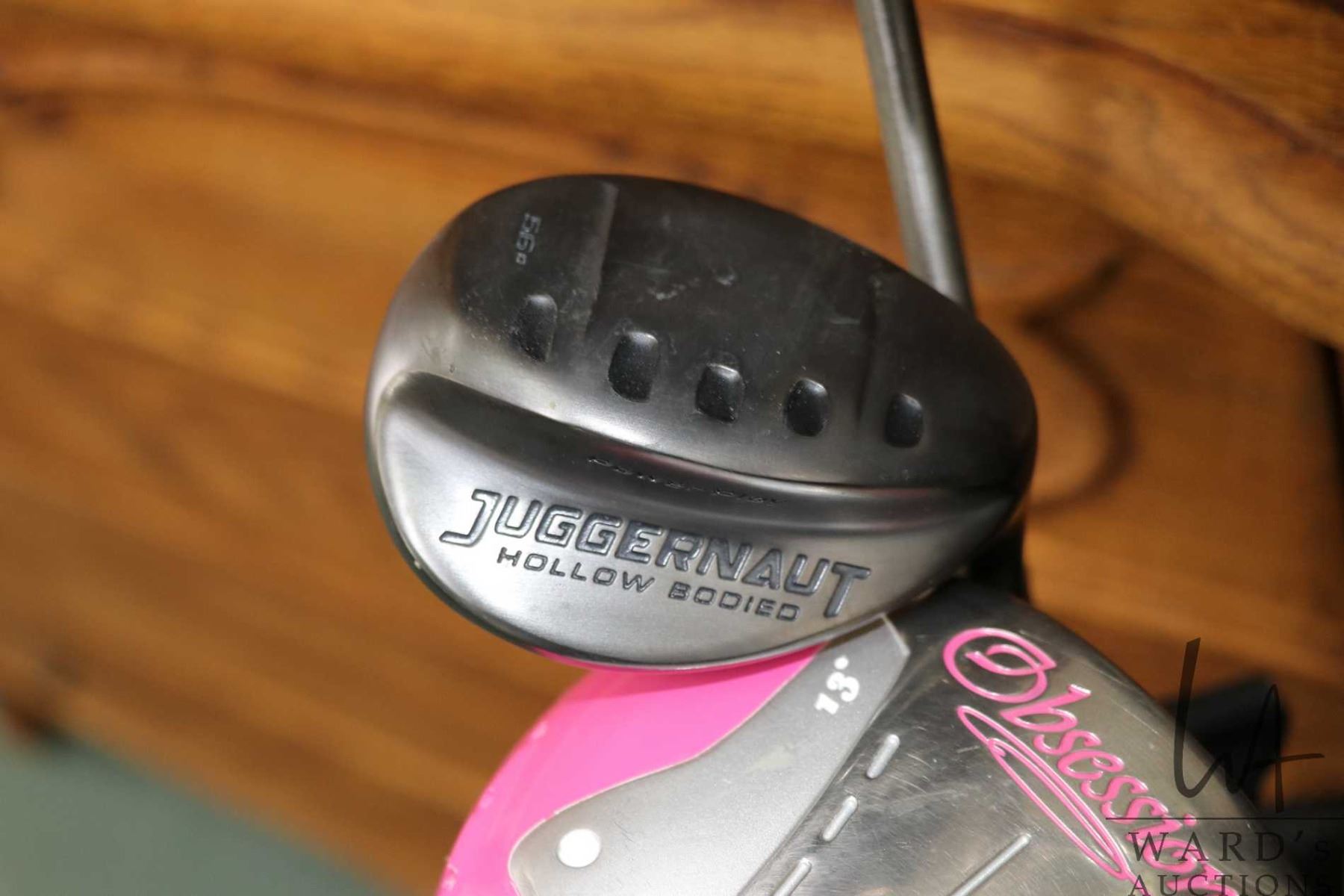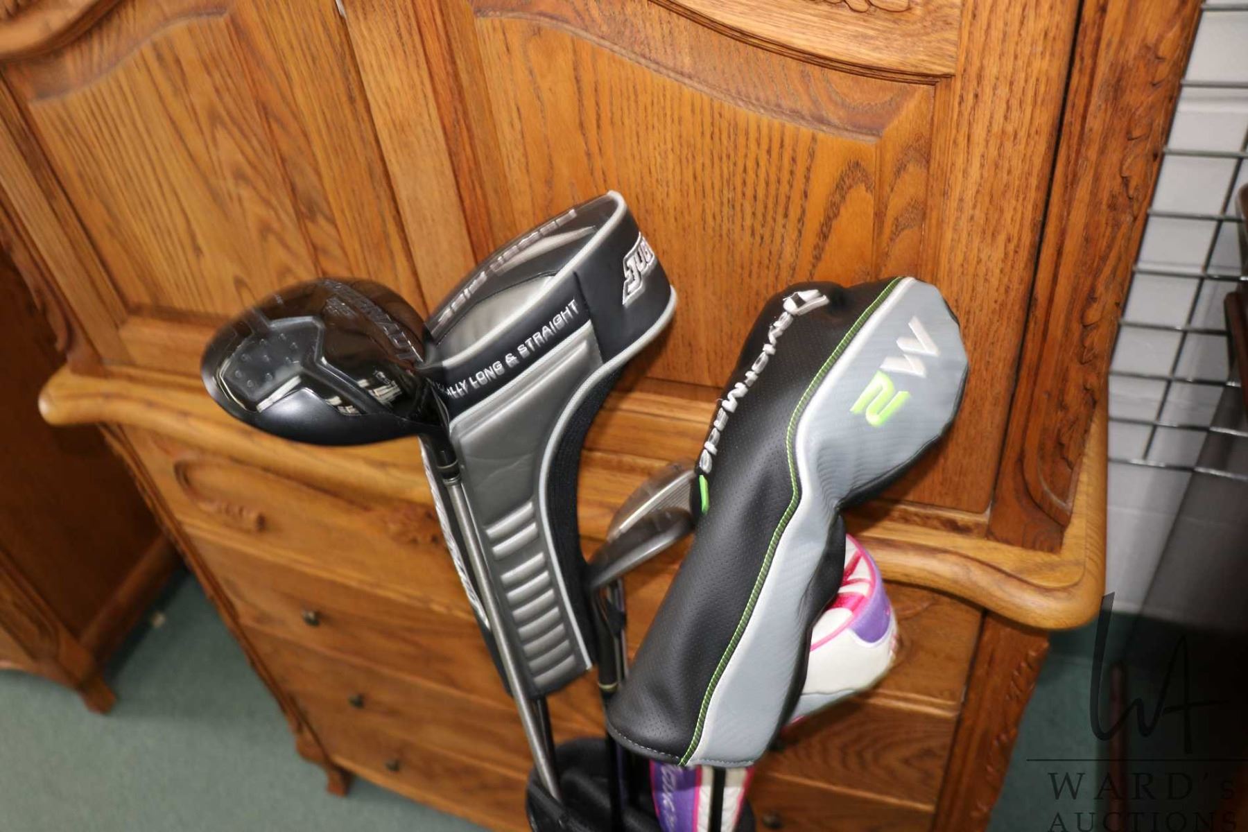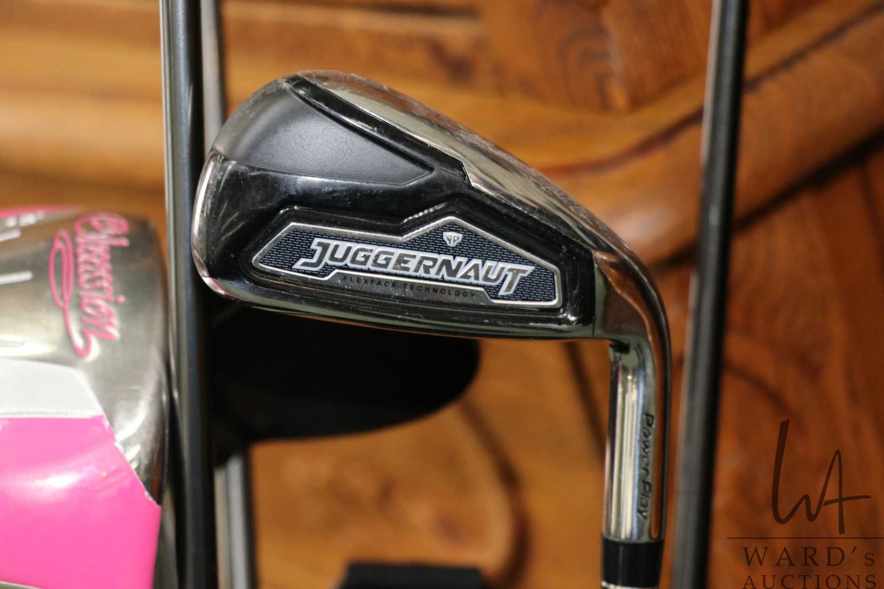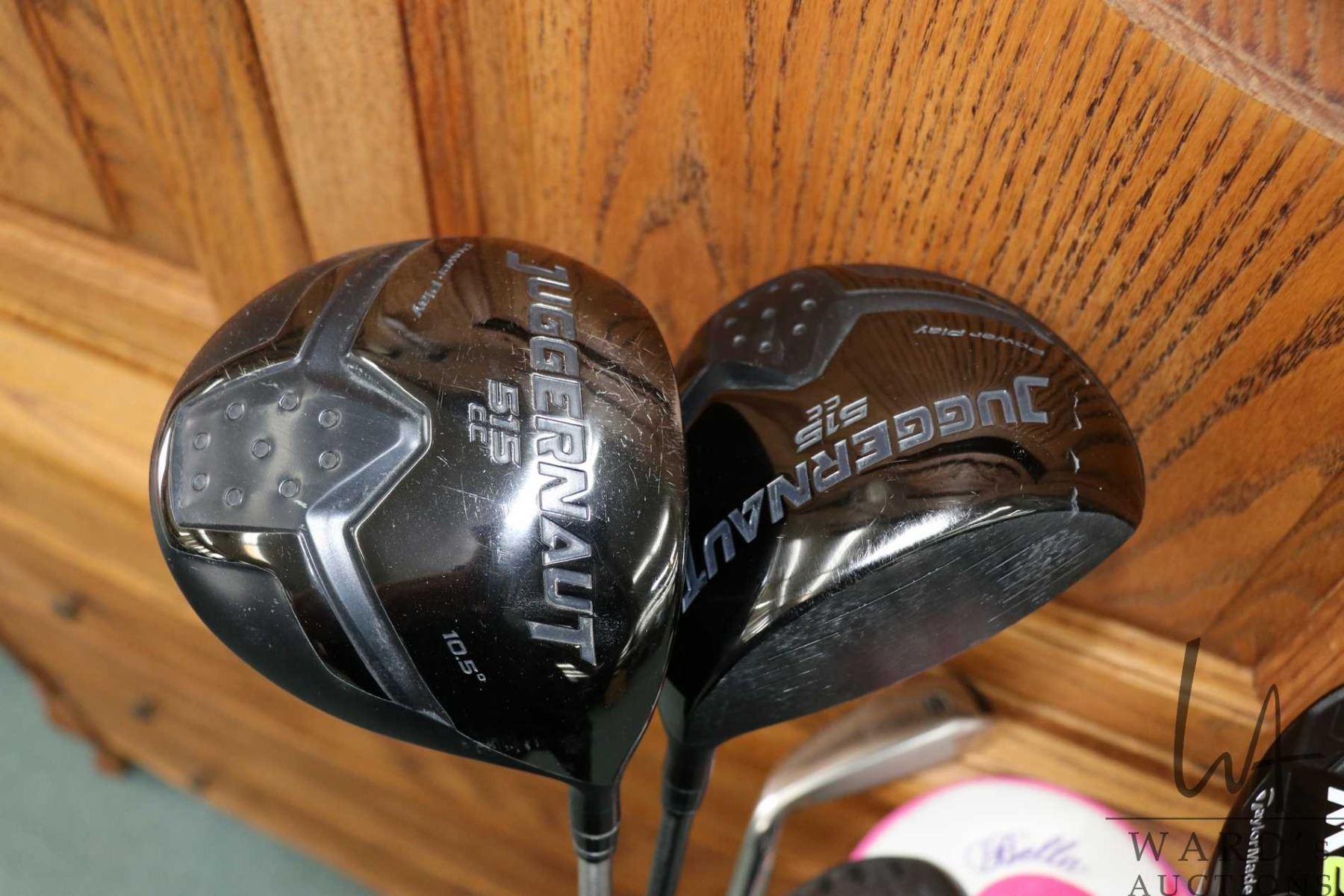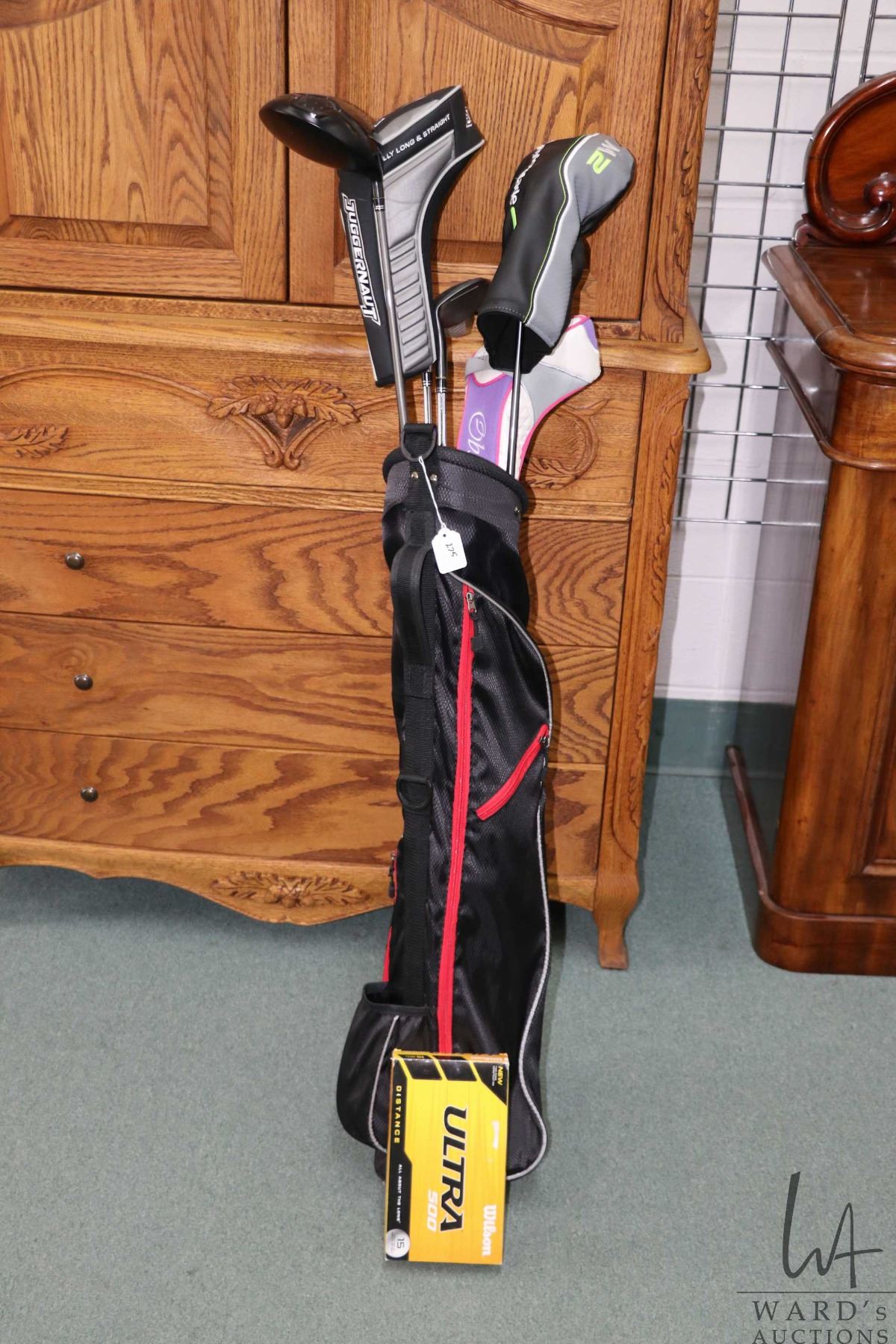 Small golf bag with six golf clubs including Taylor Made M2, two Juggernaut 515 CC drivers, two Juggernaut irons etc. plus one 15 count box of Wilson Ultra 500 golf balls