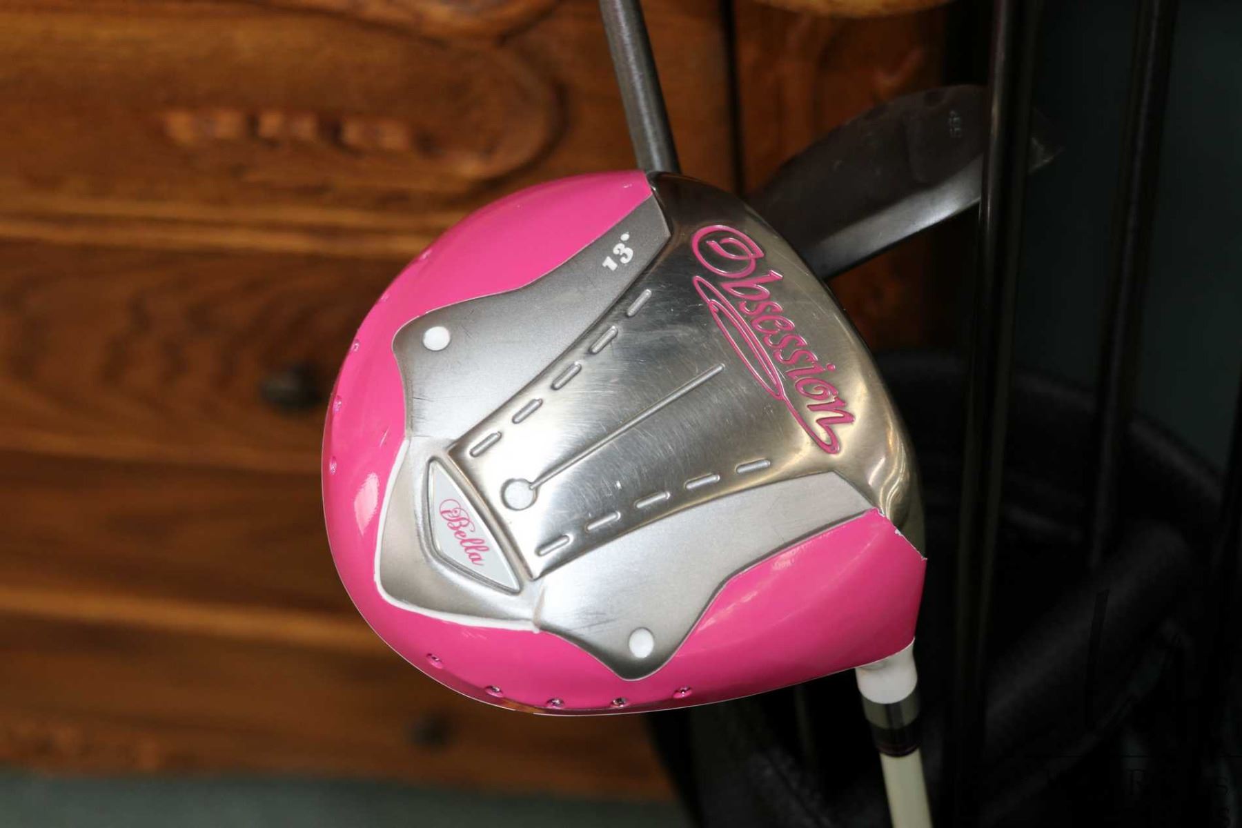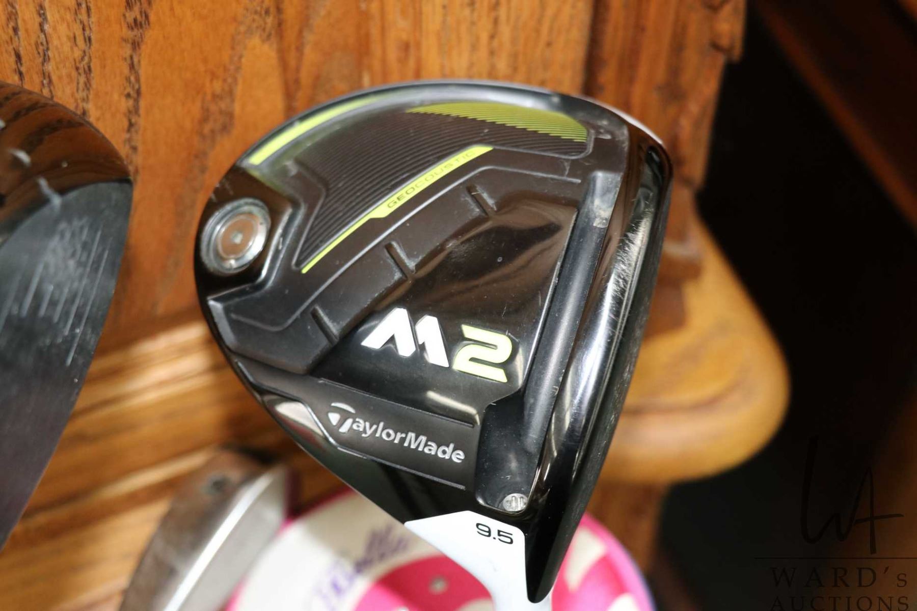 Small golf bag with six golf clubs including Taylor Made M2, two Juggernaut 515 CC drivers, two Jugg