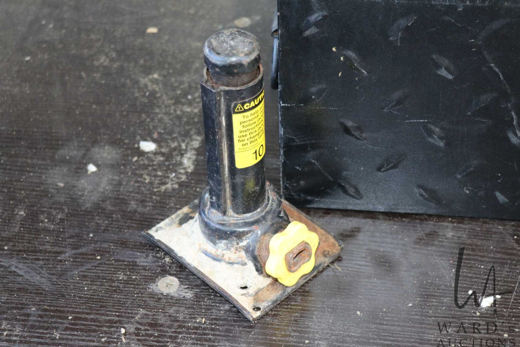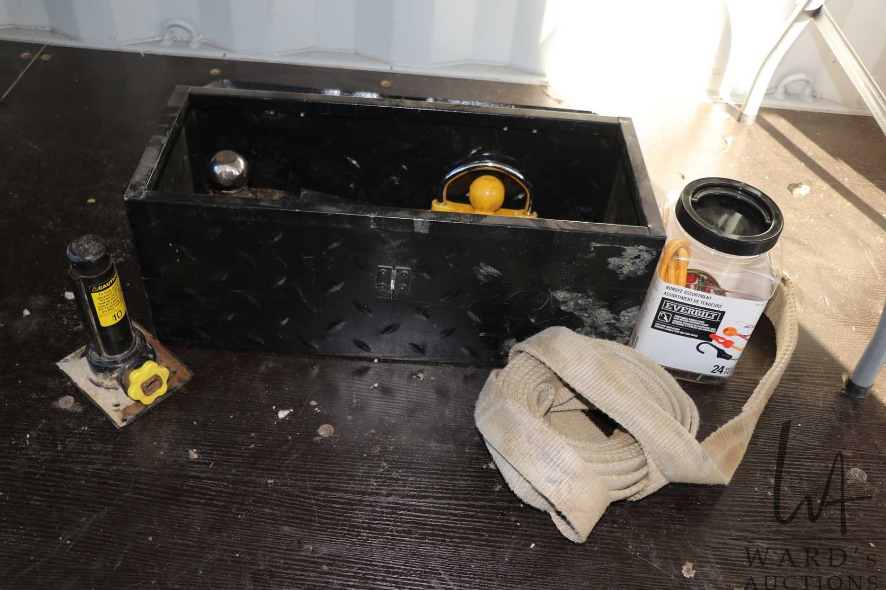 Small metal tool chest with latch including trailer hitches, spare trailer balls and pins, automotive fuse kit, hitch lock, 4-7 pin trailer adapter, Reese trailer hitch lock, a bottle jack, a tow strap, and a selection of bungee straps