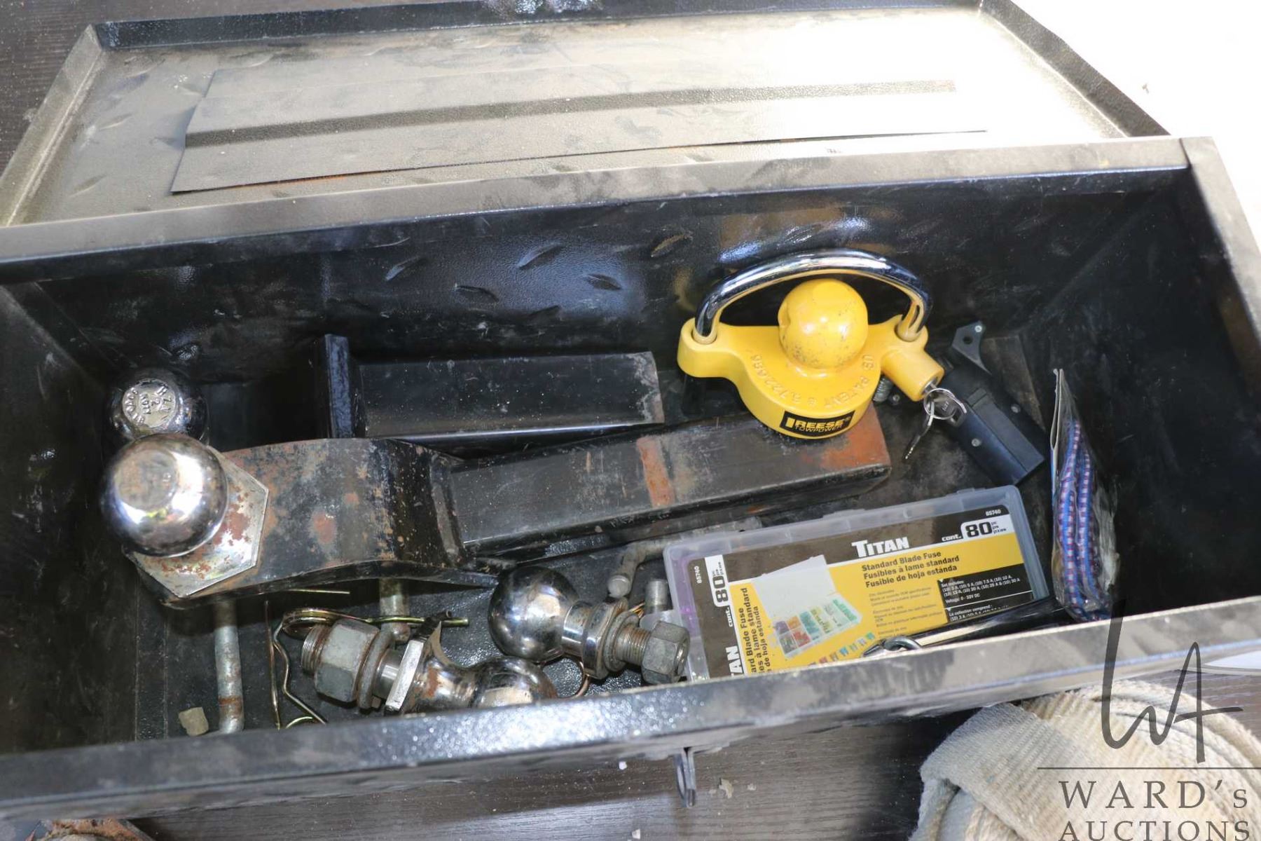 Small metal tool chest with latch including trailer hitches, spare trailer balls and pins, automotiv