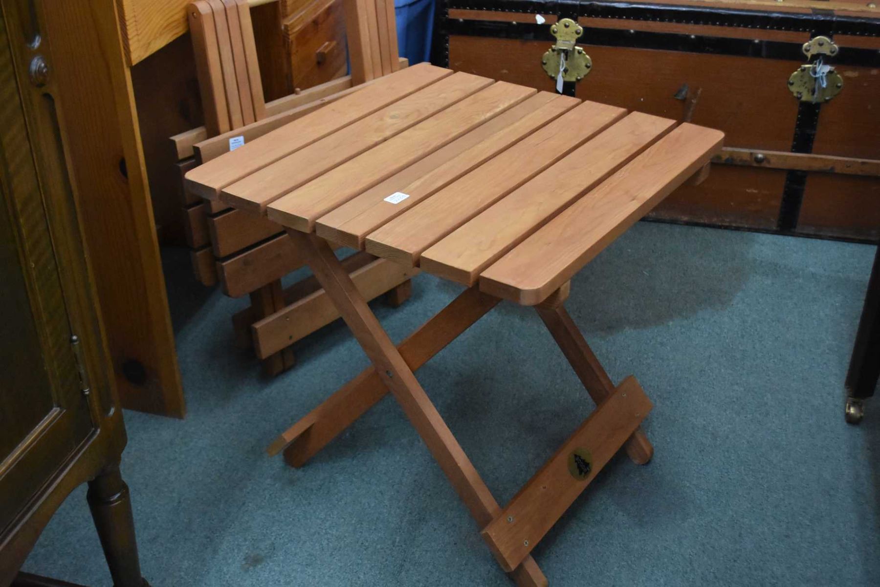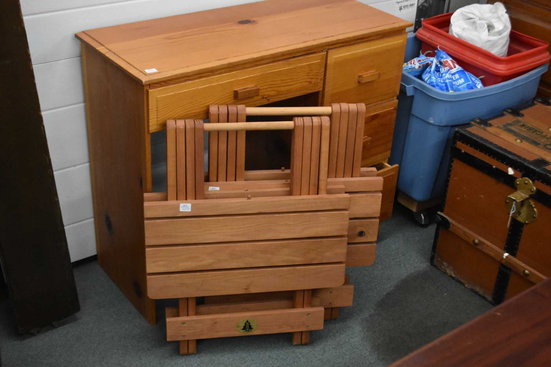 Small pine single pedestal student desk and two redwood folding tables made by Woods