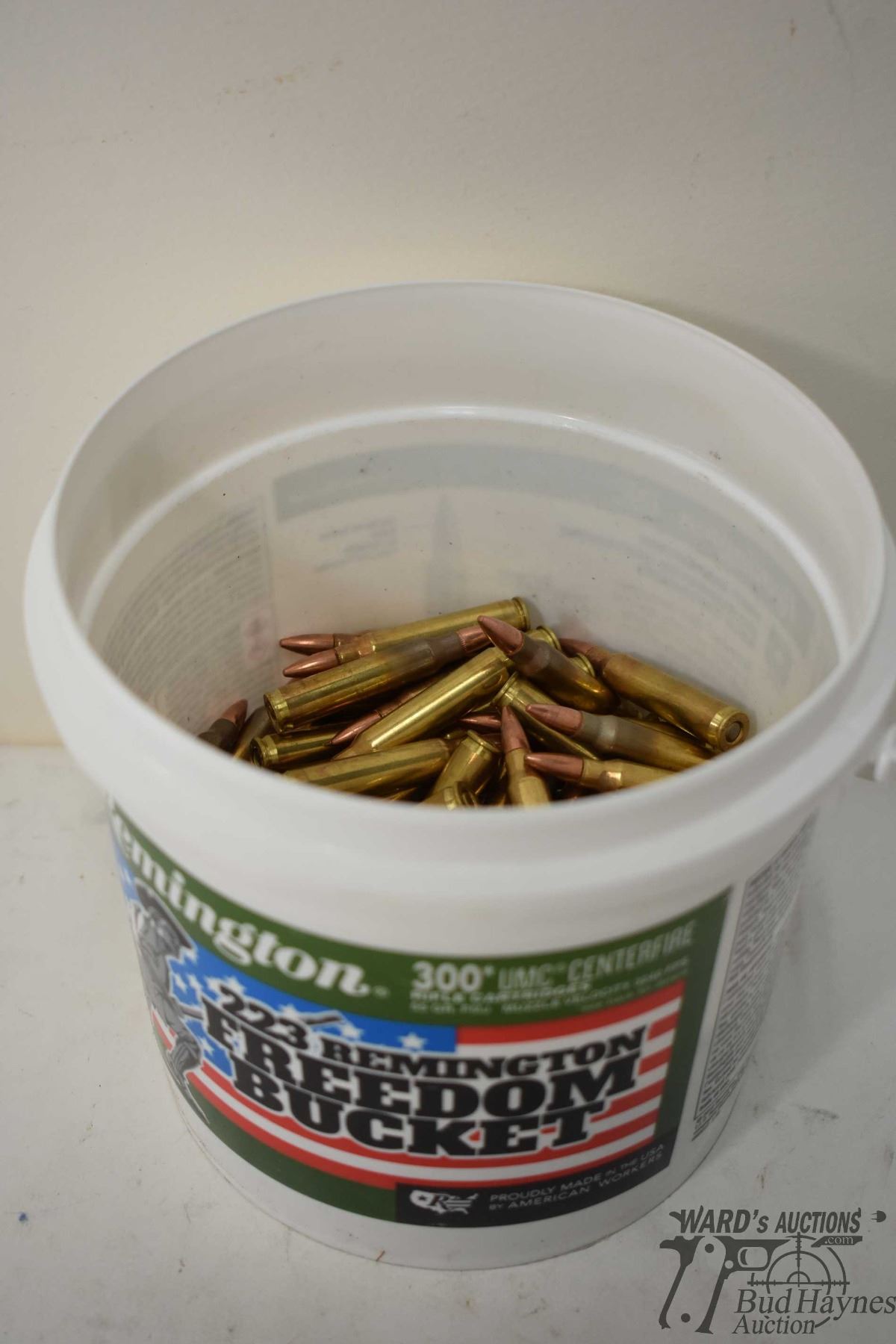 Small plastic bucket w/ 150 rounds of Remington .223 rem 55 gr FMJ