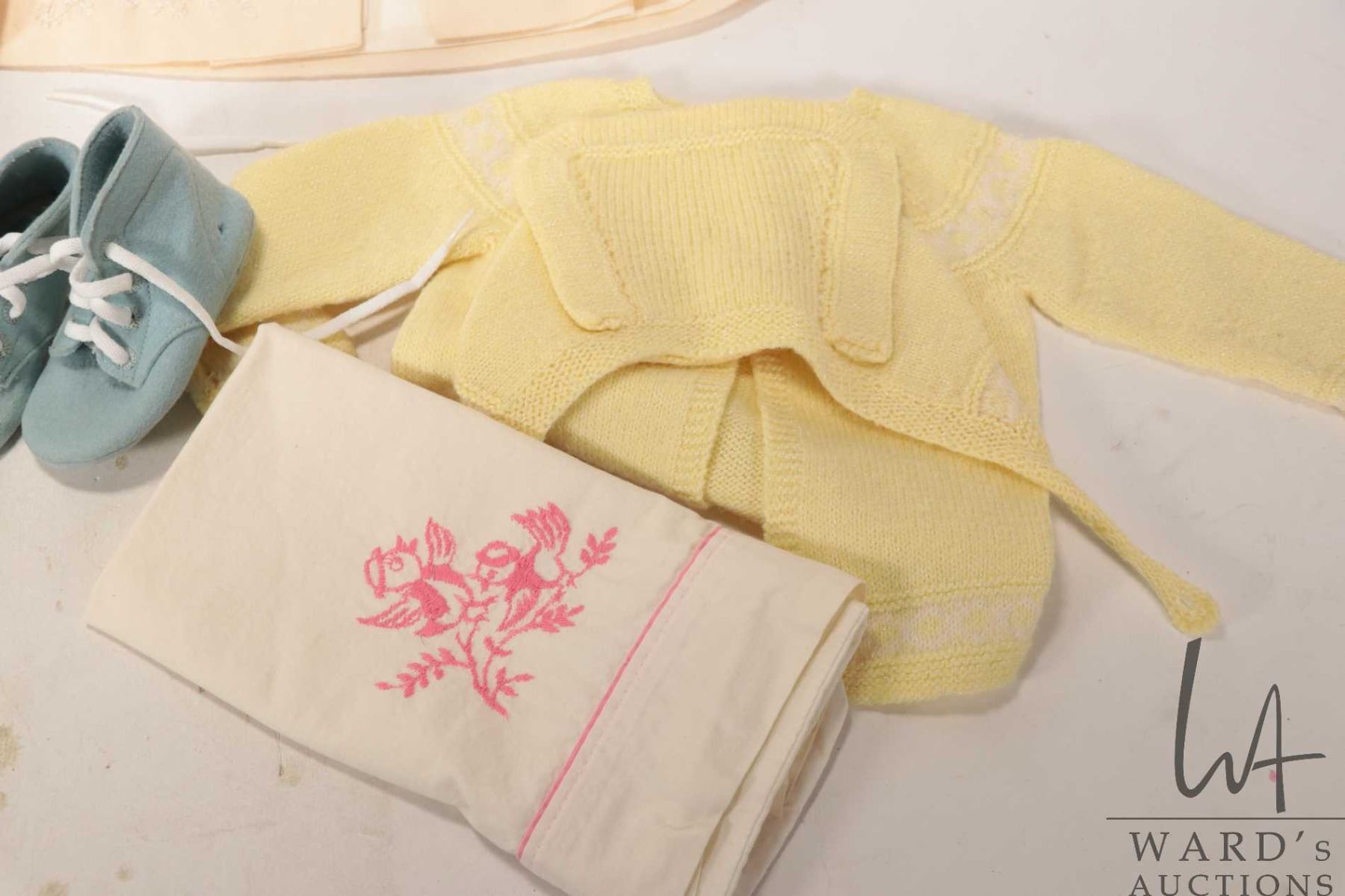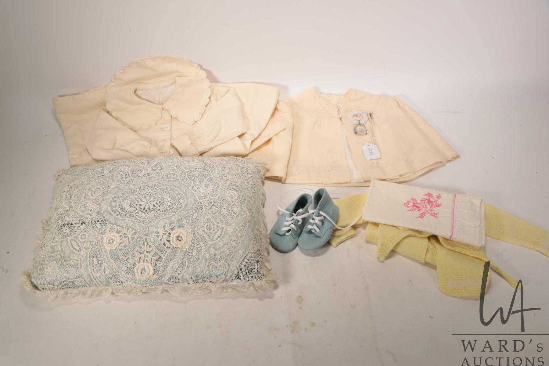 Small selection of baby items including lace pillow, wool coats, silver baby rattle and a sterling silver toothbrush handle