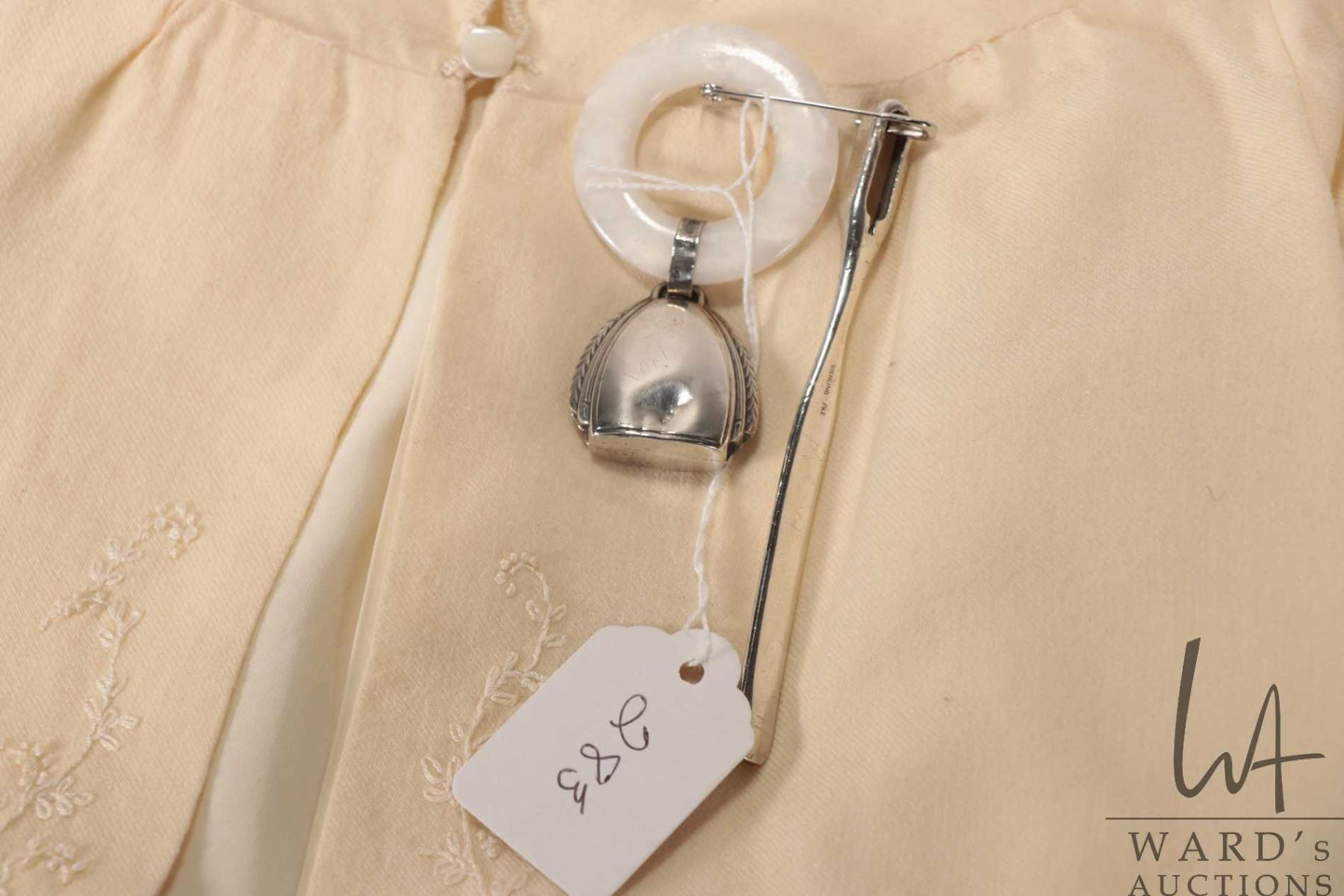 Small selection of baby items including lace pillow, wool coats, silver baby rattle and a sterling s