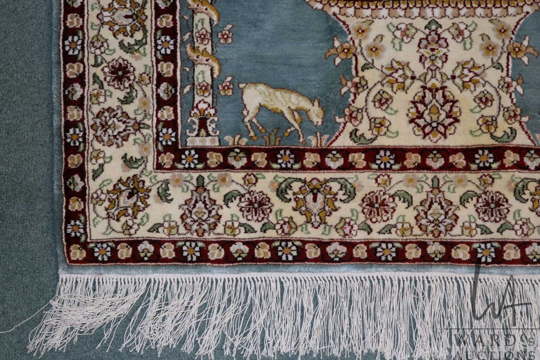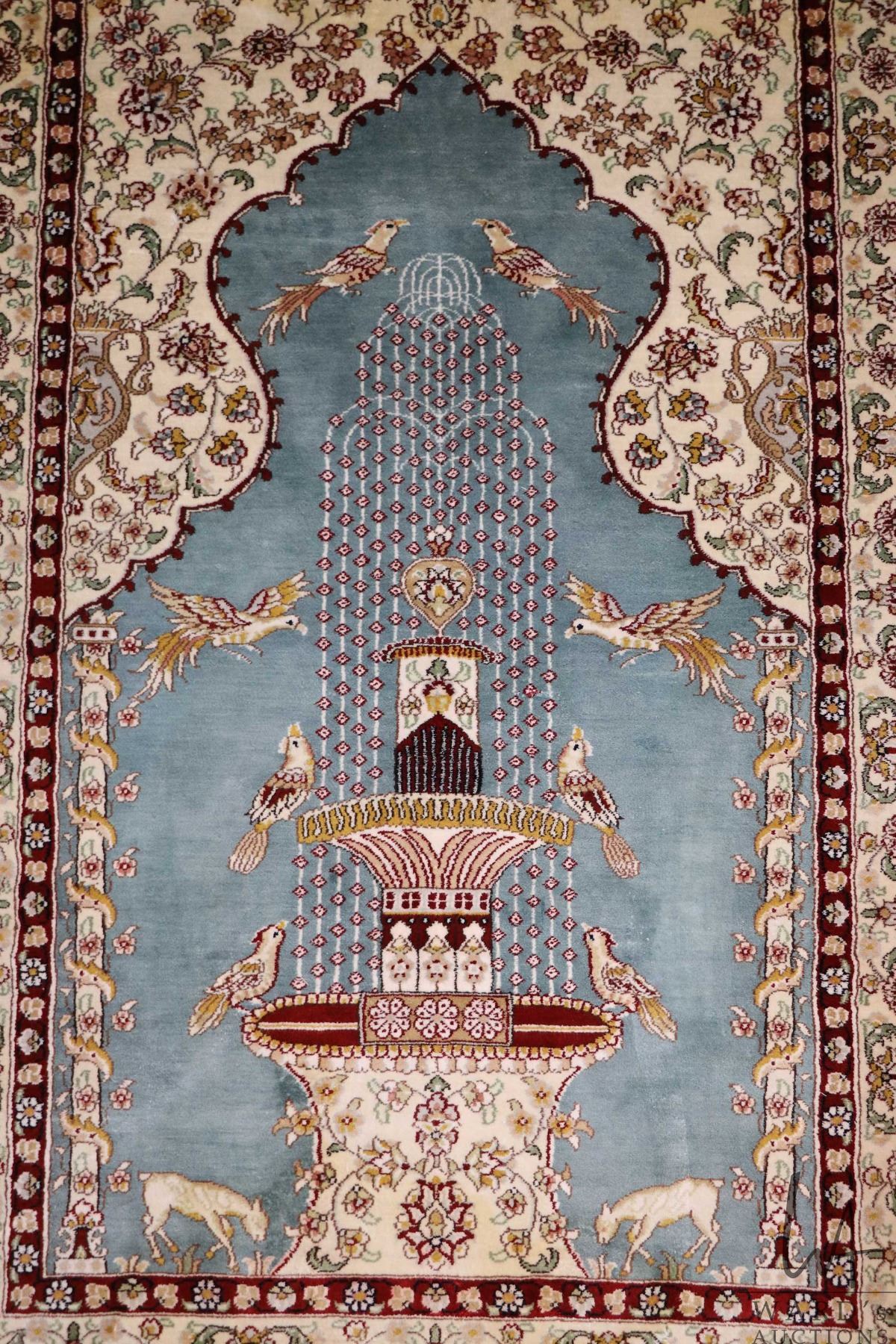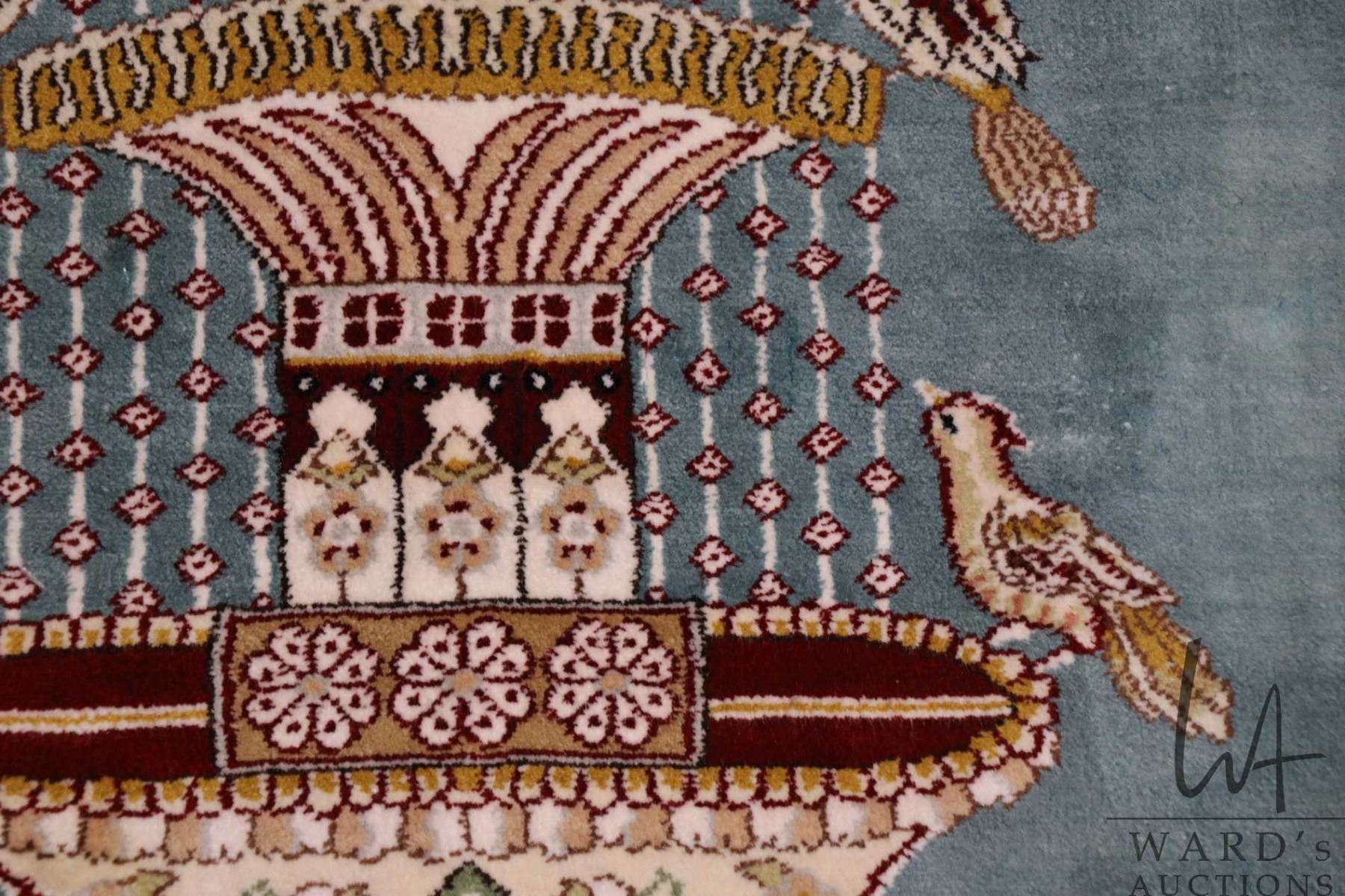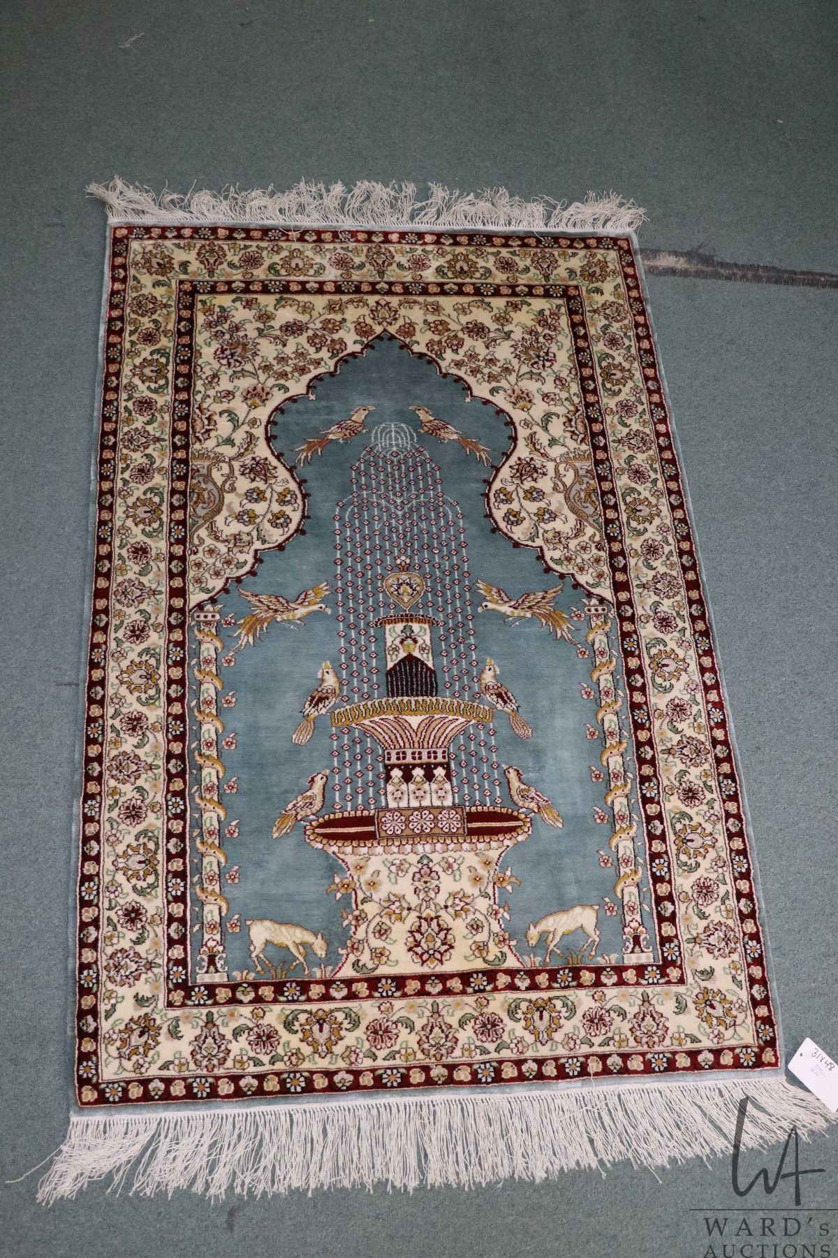 Small silk blend fringed area carpet with blue background, bird and fountain motif and highlights of