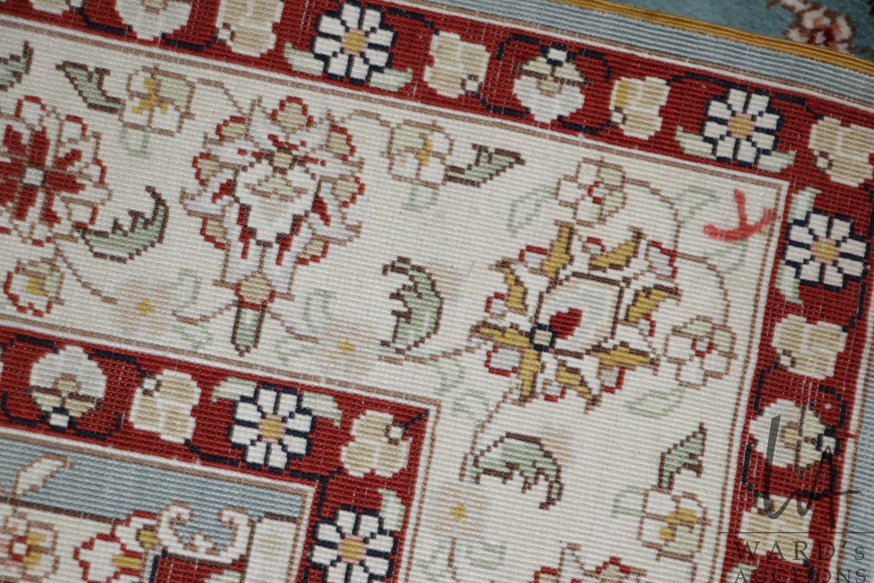 Small silk blend fringed area carpet with blue background, bird and fountain motif and highlights of cranberry, cream pink etc. 31" X 48"