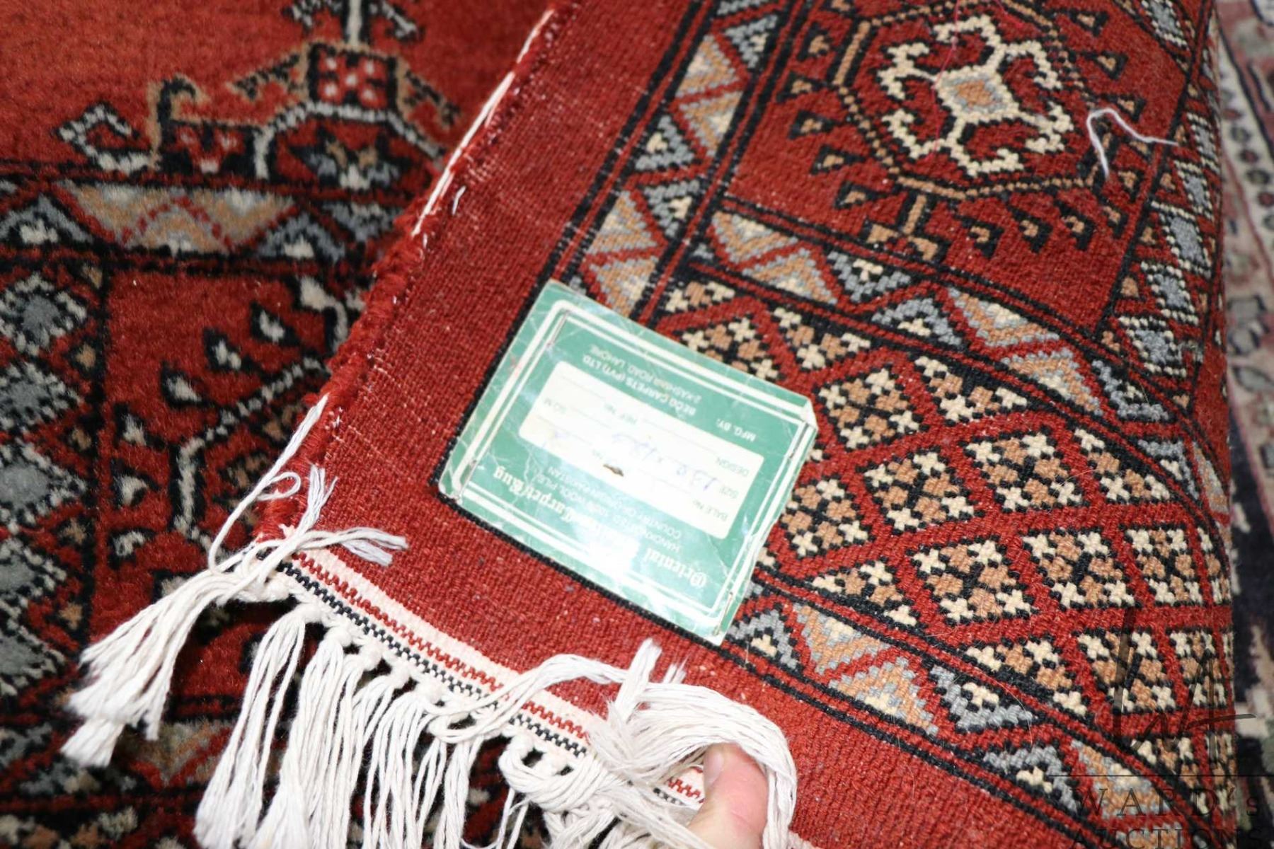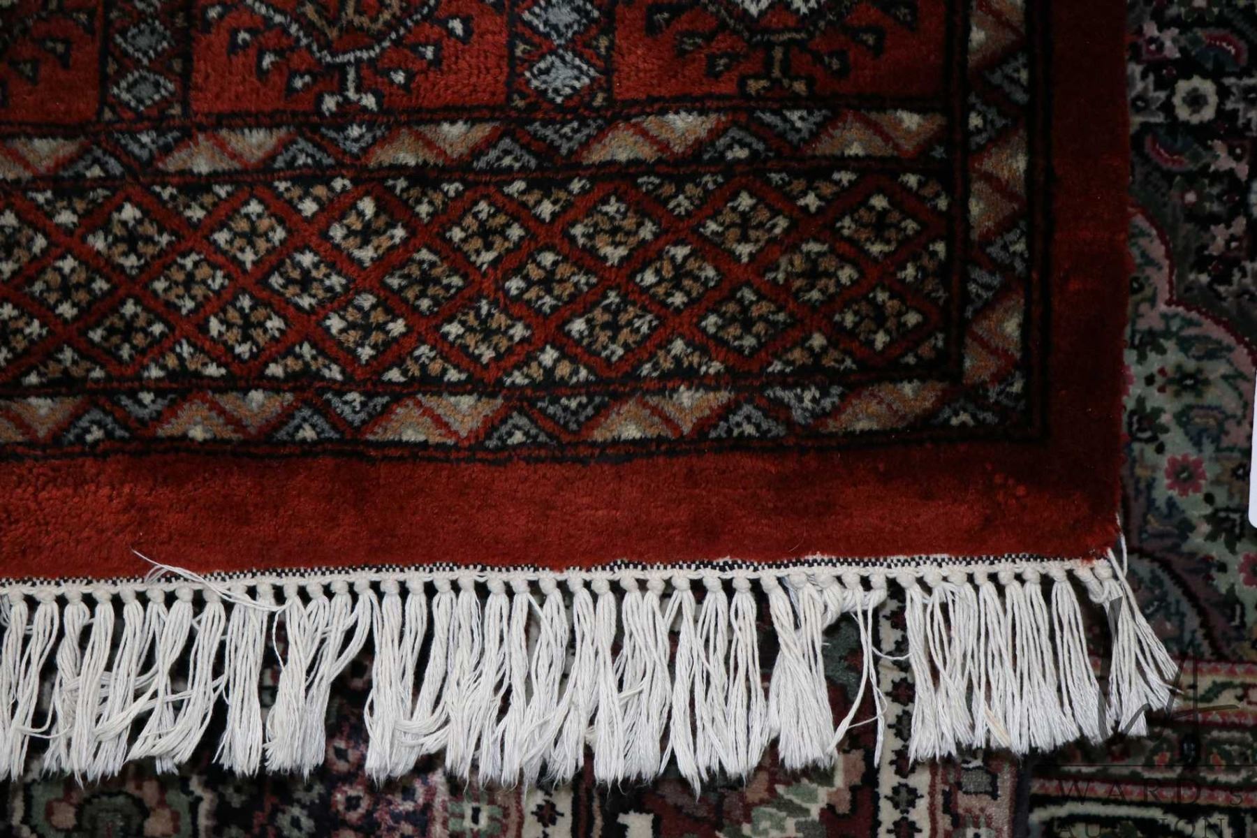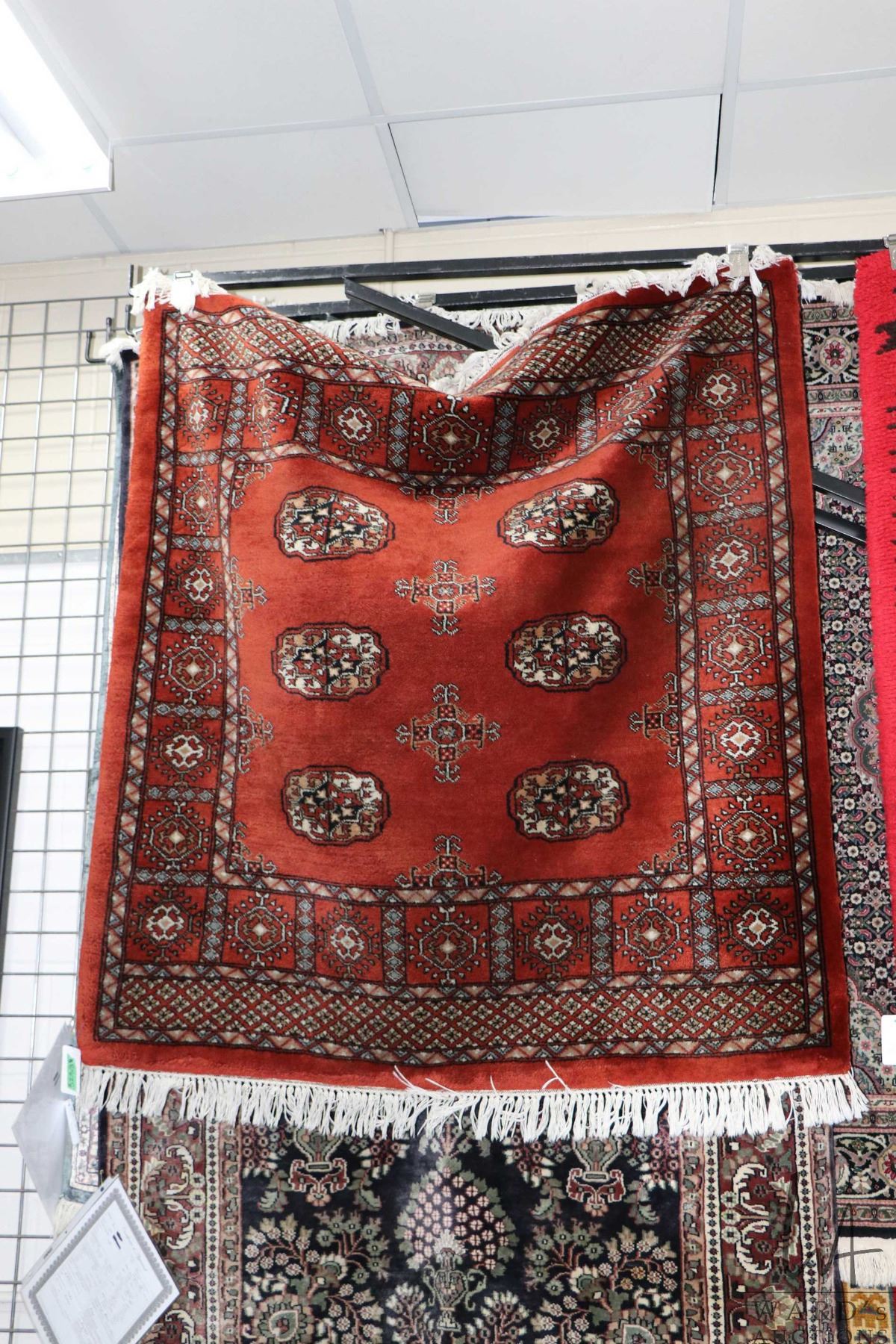 Small square wool area carpet with deep brick background, geometric design, fringed edge and highlights of blue, cream and taupe, 48" X 51"