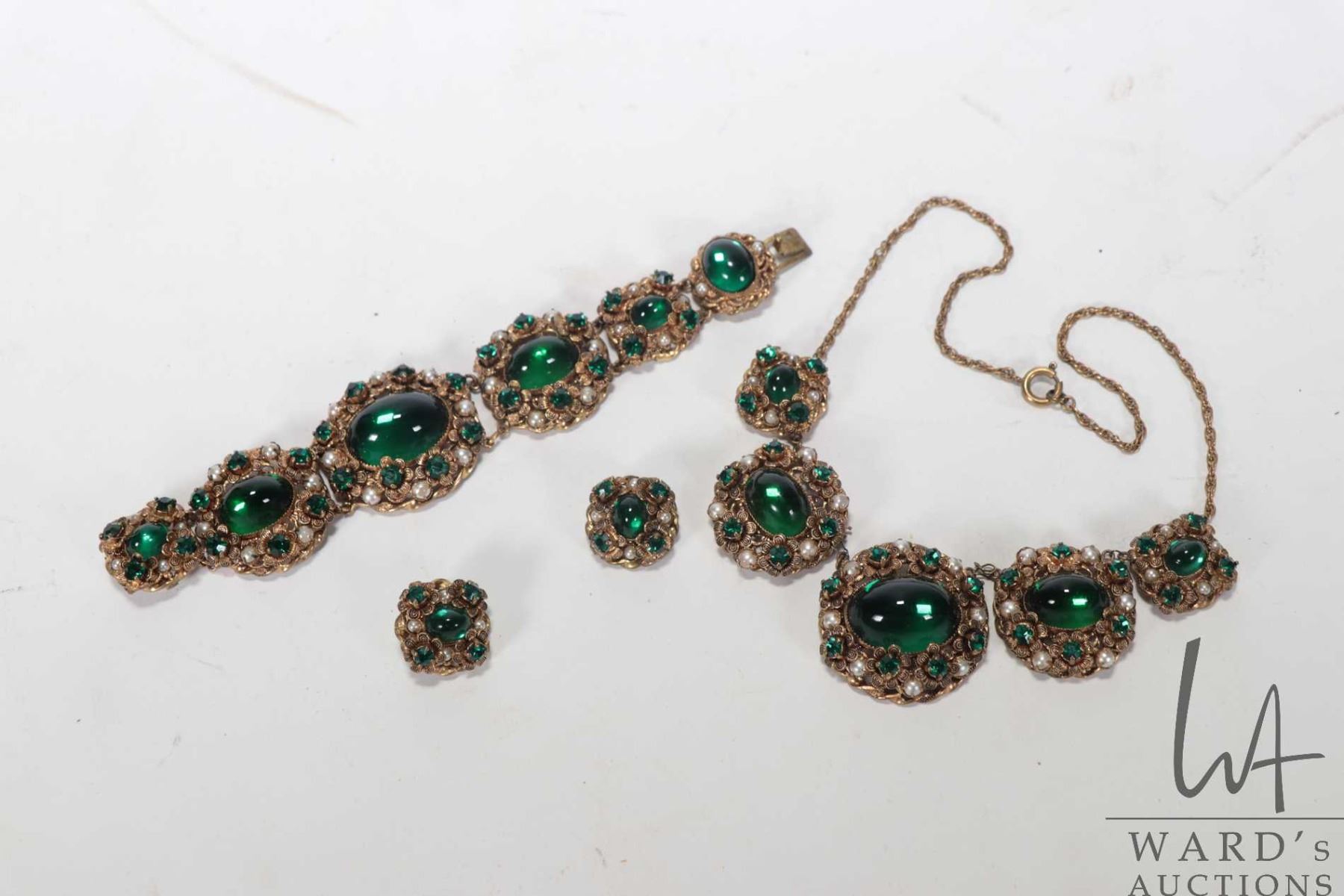 Small suite of antique style jewelry with pearl like and emerald like gemstones and cabochon green stones including necklace, earrings and bracelet.