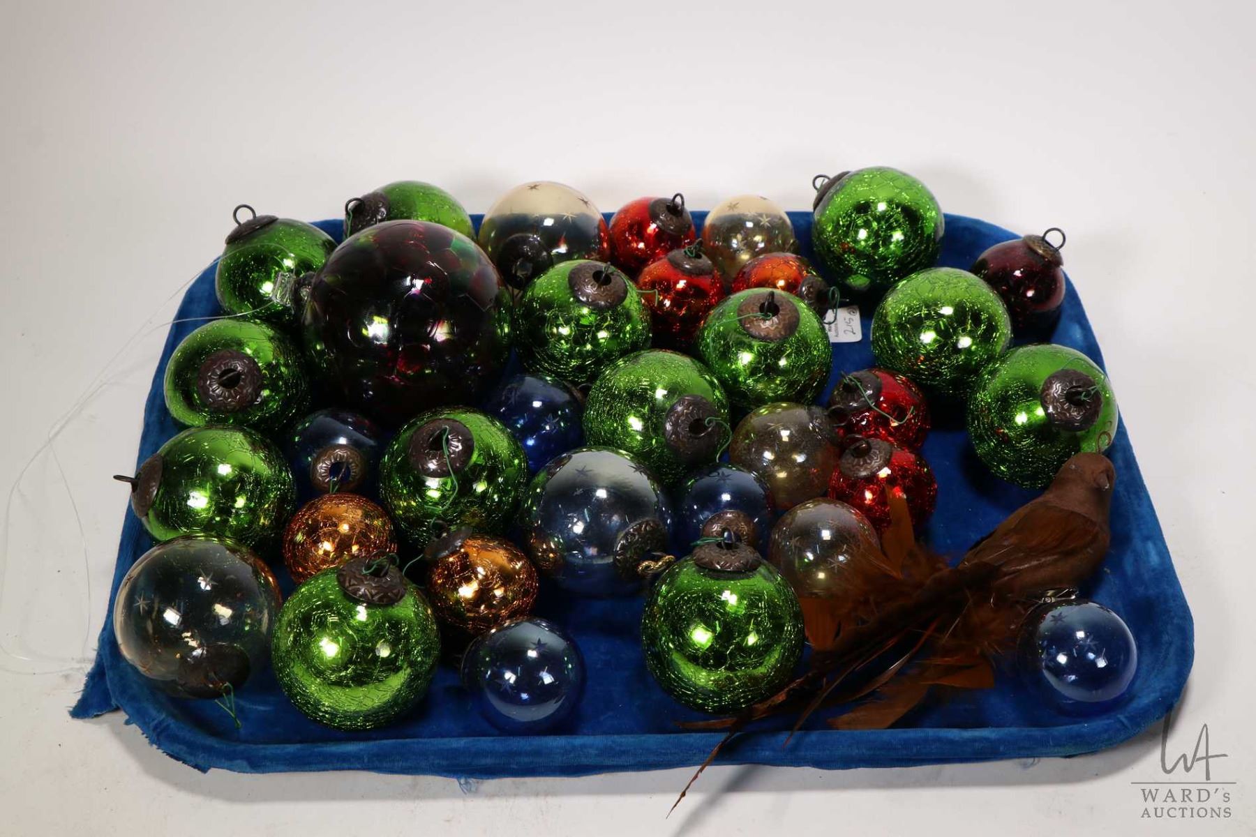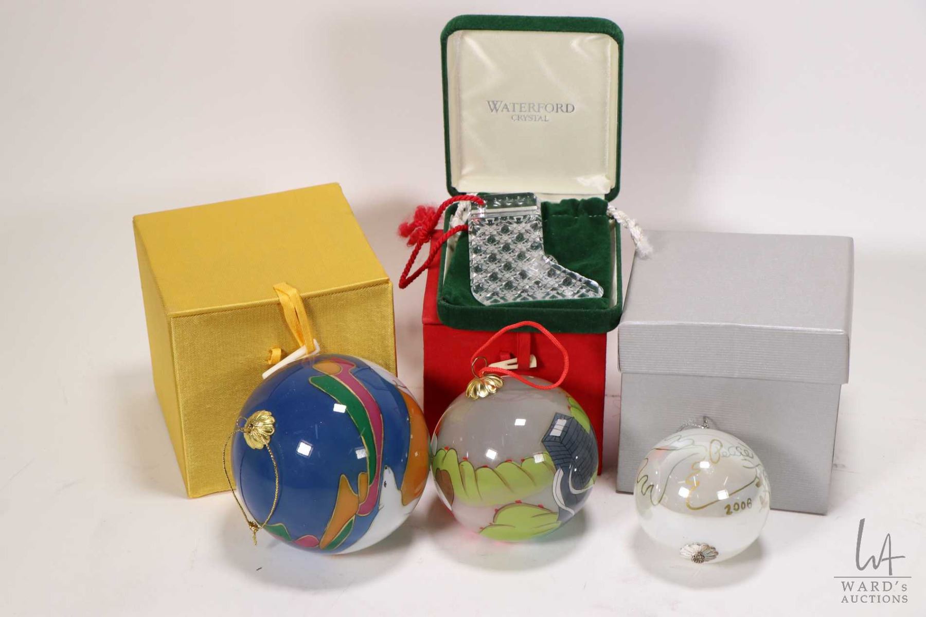 Small tray lot of collectibles including Birks sterling silver dish with cobalt liner 3 1/2" in diameter, a crystal sugar shaker with British sterling top, blue and white glass vase with sterling collar, a pair of shakers and two silver overlay aperitif glasses signed Hawkes