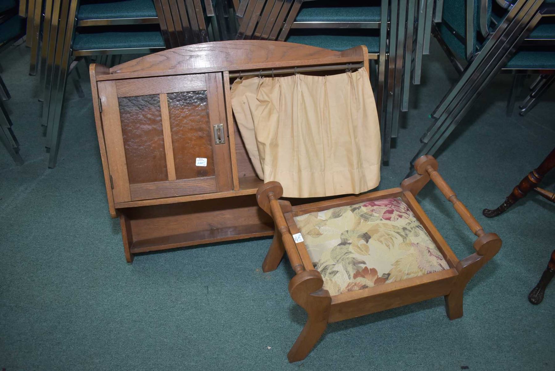Small upholstered stool and an antique oak wall mount bathroom cabinet with stain glass door and curtain covered cubby hole