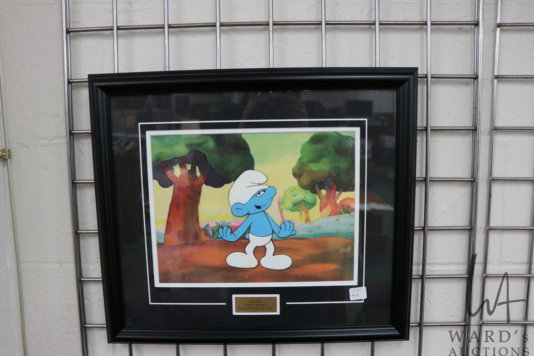 Smurfs hand painted production cel, overall dimensions 18 1/2"X 16" overall dimensions including fra