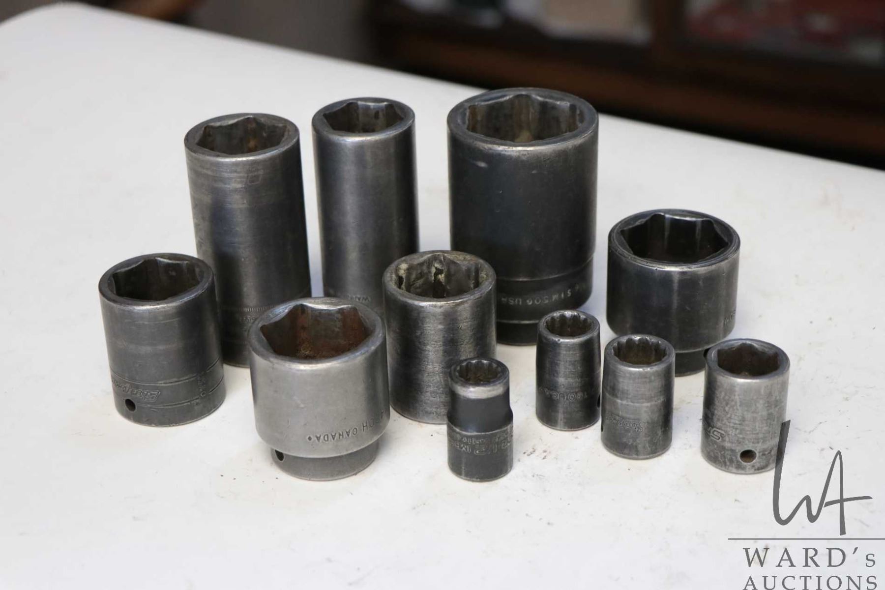 Snap-On 1/2  drive deep impact sockets including 1 1/16 , 1 9/16  and 30mm, plus shallow impact 1/2