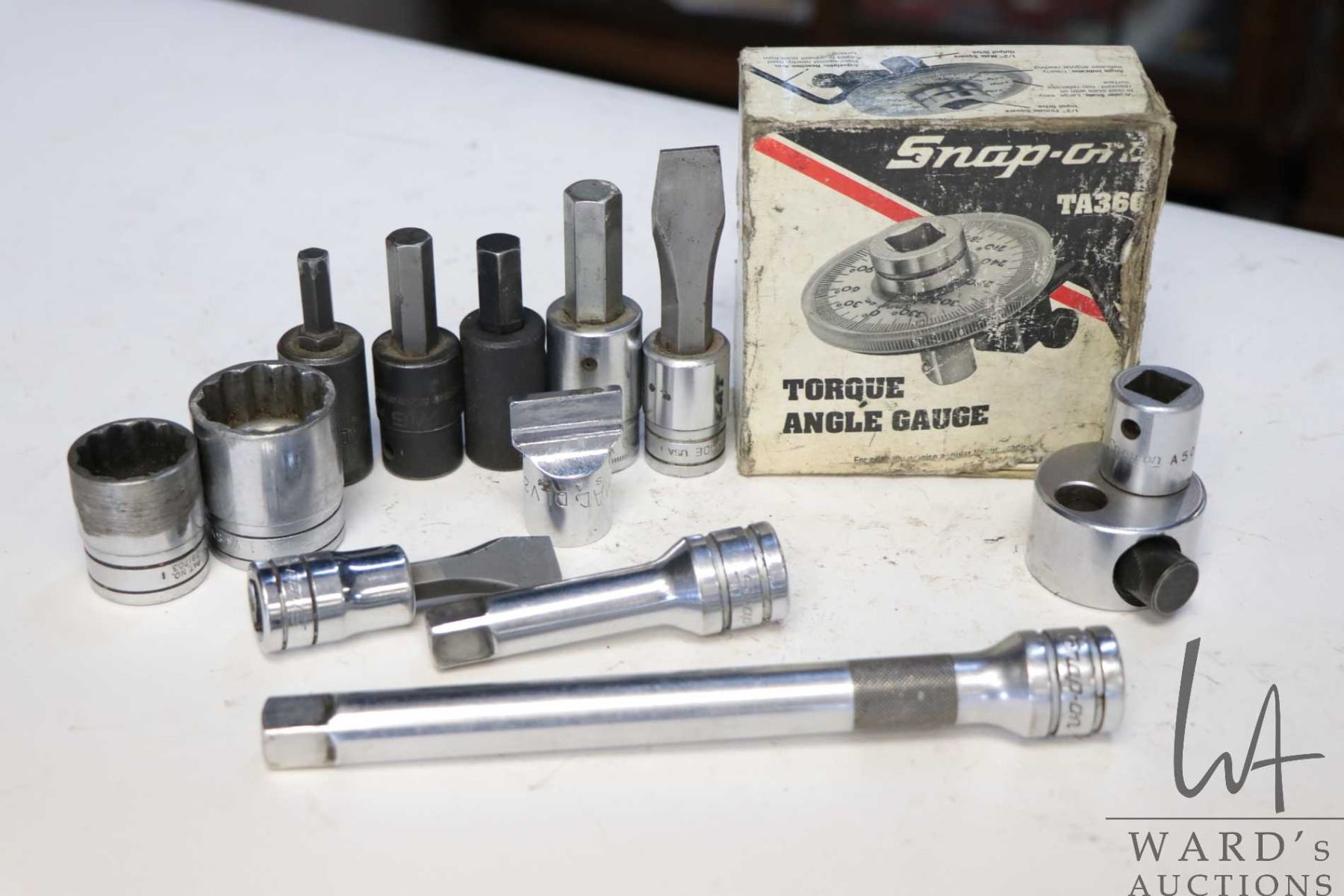 Snap-On 1/2" drive shallow impact sockets including 15/16" and 1 1/8", two blade type sockets, hex head including 14mm and 7 /16", torque angle gauge stud remover, one Mac Tools blade socket and two Mac Tools hex head including 16mm and 7/16"