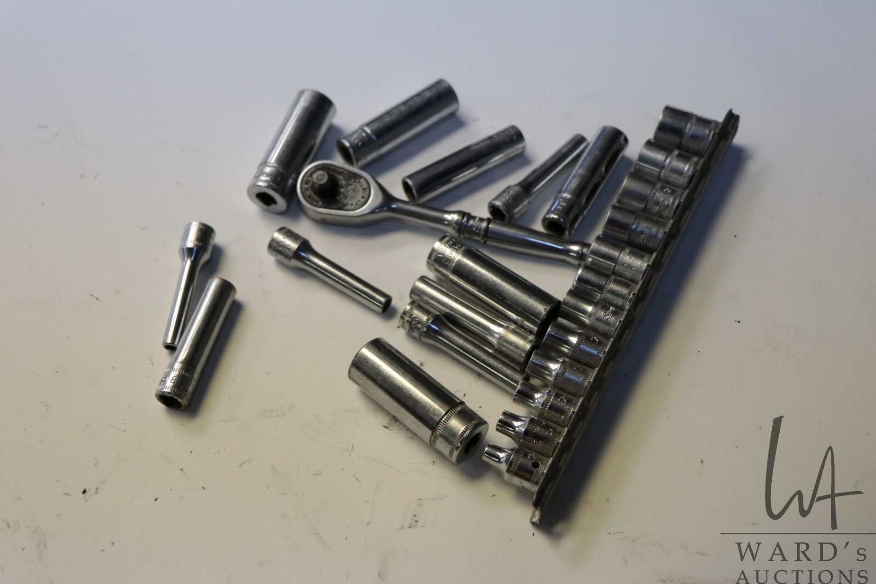 Snap-On 1/4" drive twelve piece metric semi deep socket set including 5, 5.5, 6, 7, 8, 9, 10, 11, 12, 13, 14, deep and shallow with ratchet