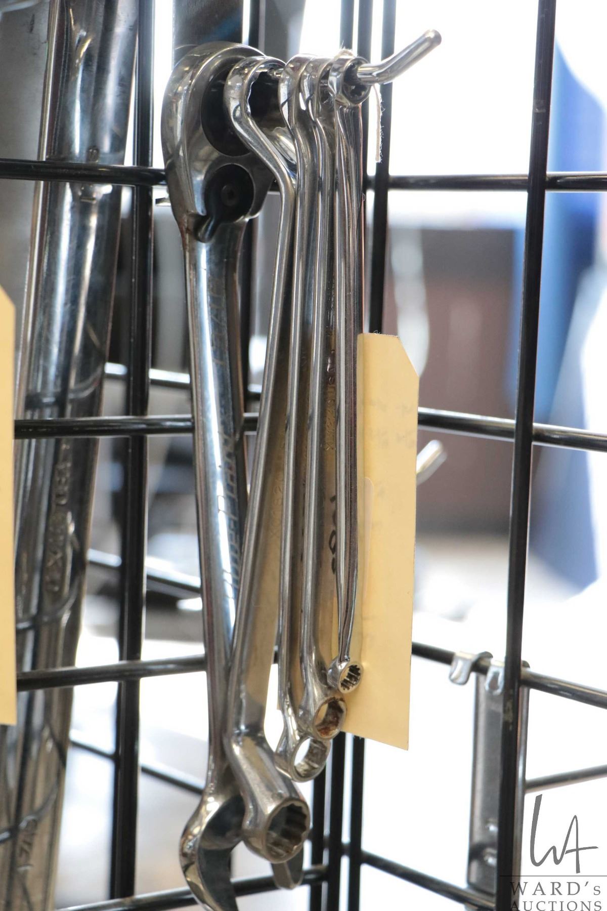 Snap-On off set box end 12 point 1/4"-5/16" and three 6 point wrenches including 3/8"-7/16", 7/16"-1/2" and 9/16"-5/8" plus a Blue-Point ratchet wrench 13/16"