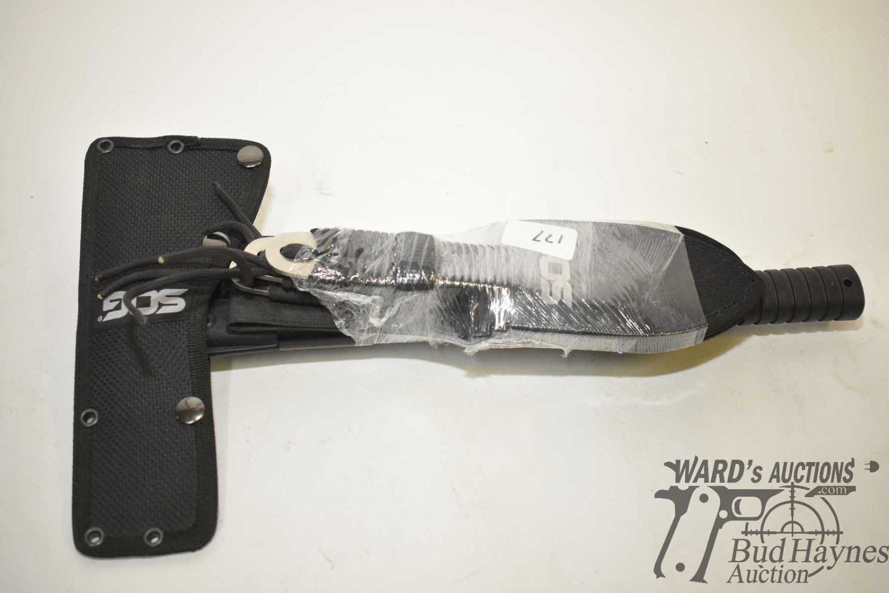 Sog hatchet-pick and a set of 3 Sog throwing Sog hatchet-pick and a set of 3 Sog throwing knives. Plus a Sog spear head